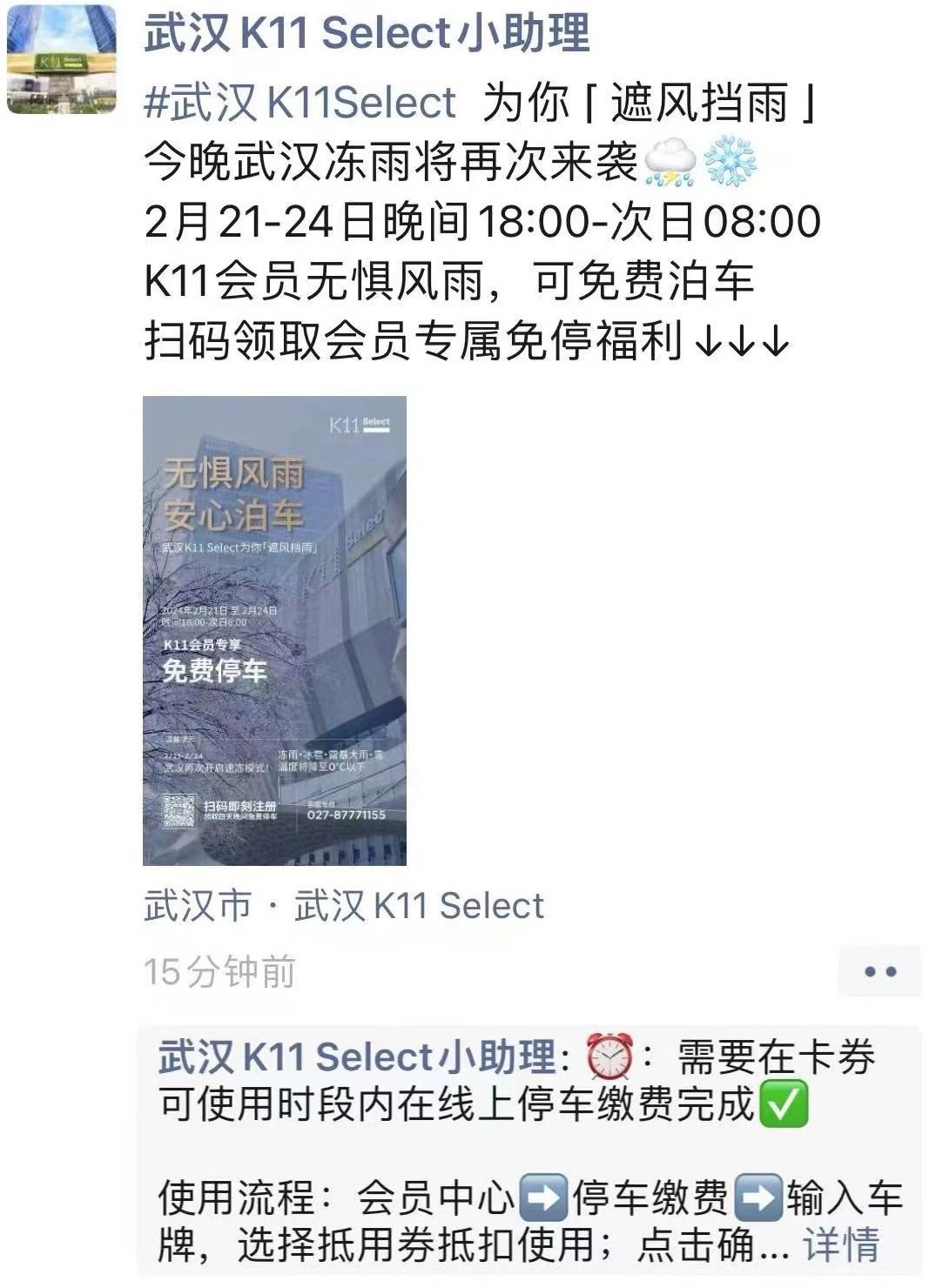 “无惧风雨,免费停车,给你点个赞。”21日下午,市民李先生刷着朋友圈,一条优惠信息让滚动的屏幕停了下来,忍不住点了个赞——武汉K11 Select小助理发布信息“今晚武汉冻雨将再次来袭,2月21至24日18:00至次日8:00,会员可免费停车”。