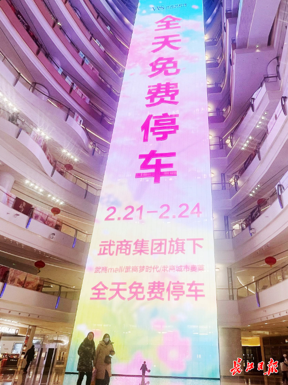 2月22日,武商梦时代大屏幕,播放武商集团旗下三大商业体免费停车的宣传语。长江日报记者何晓刚 摄