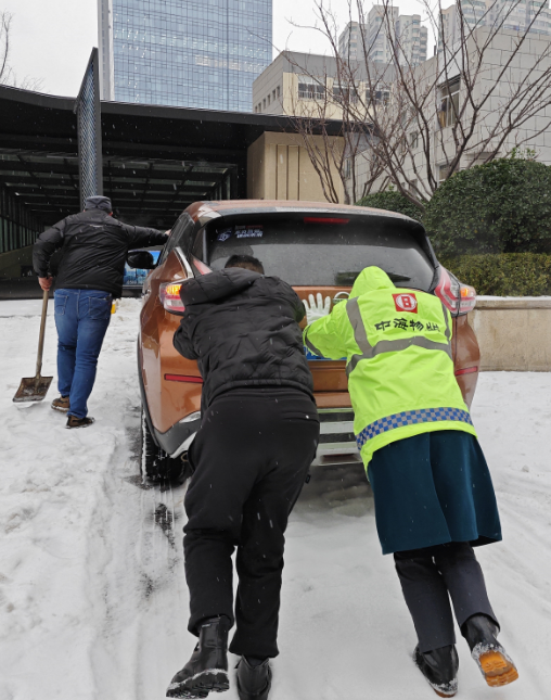 21日17时,中海万松九里小区物业发布免费停车信息,业主卢先生第一时间做了登记,次日一早便将车挪进了小区。车库门口,卢先生的车打滑,三名物业工作人员一边铲雪,一边将车推进了地库。