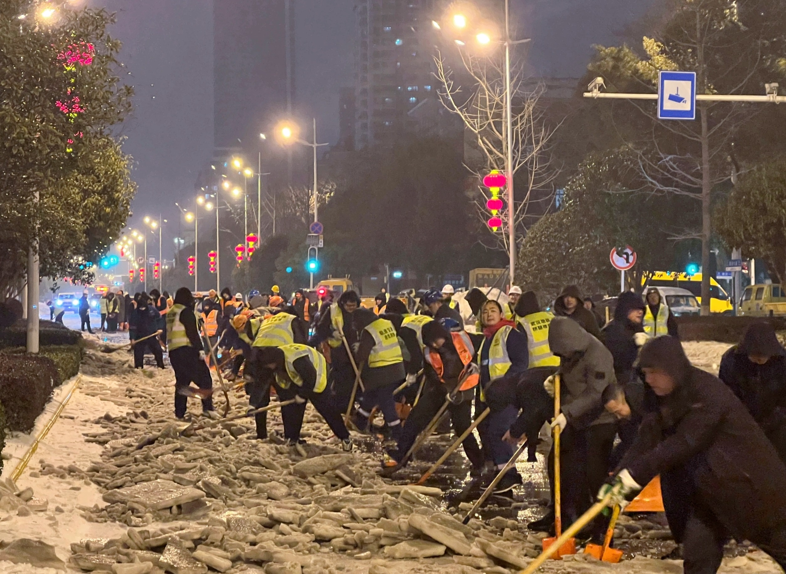 22日晚,300名地铁人连夜在建设大道铲雪除冰。通讯员供图