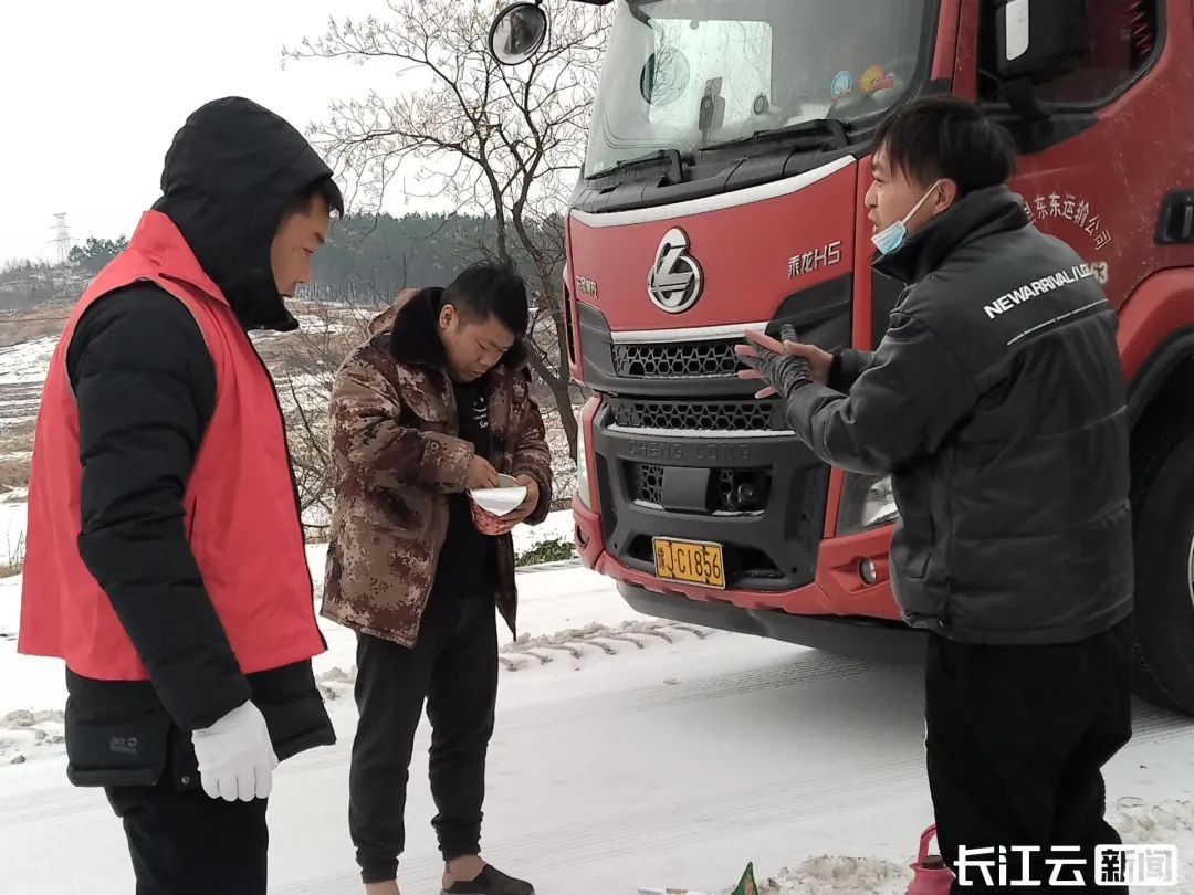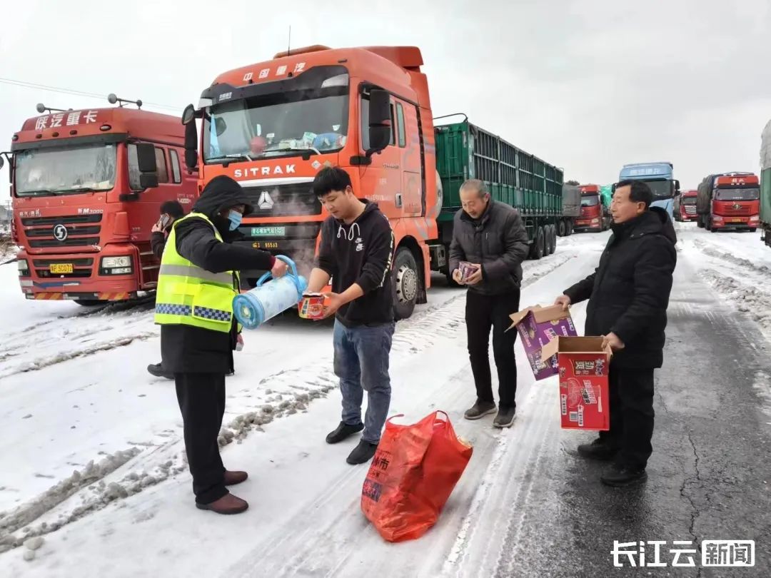 昨晚(2月21日)至今晨,湖北107国道孝昌王店段因北向雪深冰厚出现拥堵,继深夜铲雪撒盐后,孝感王店镇及时增调3台大铲车、加紧调拨融雪剂3吨,紧急调度各方力量70余人,在107国道开展铲冰除雪保畅攻坚行动。同时,对北向滞留旅客,开展暖心服务,组织机关干部和沿线河口、东风等村20多名干群,第一时间向滞留货车司机送温暖,免费发放开水、面包、饼干等物资,共计8000多元。