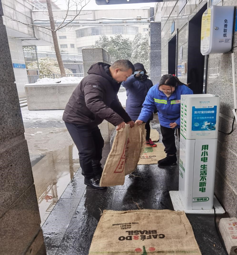 自武汉市气象局发布本轮寒潮预警以来,武昌区厕所管理站提前备足融雪剂和麻袋等物资,分发到每一座公厕。为应对低温返潮现象,各公厕保洁员使用吸水性强的海绵拖把处理地面,确保地面干净整洁无水渍,并及时在公厕门口台阶、坡道等处铺设麻袋,防止路面结冰打滑。