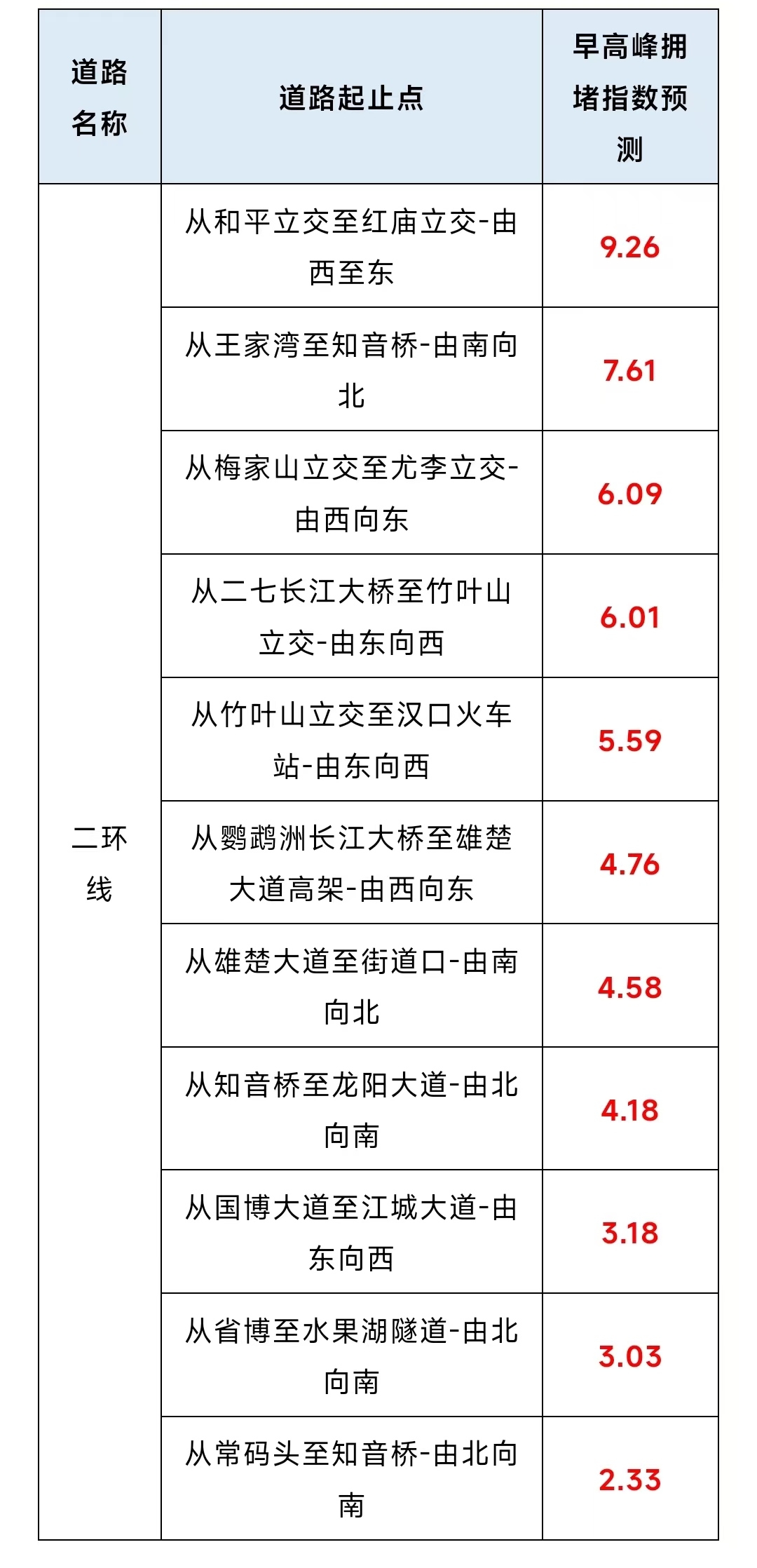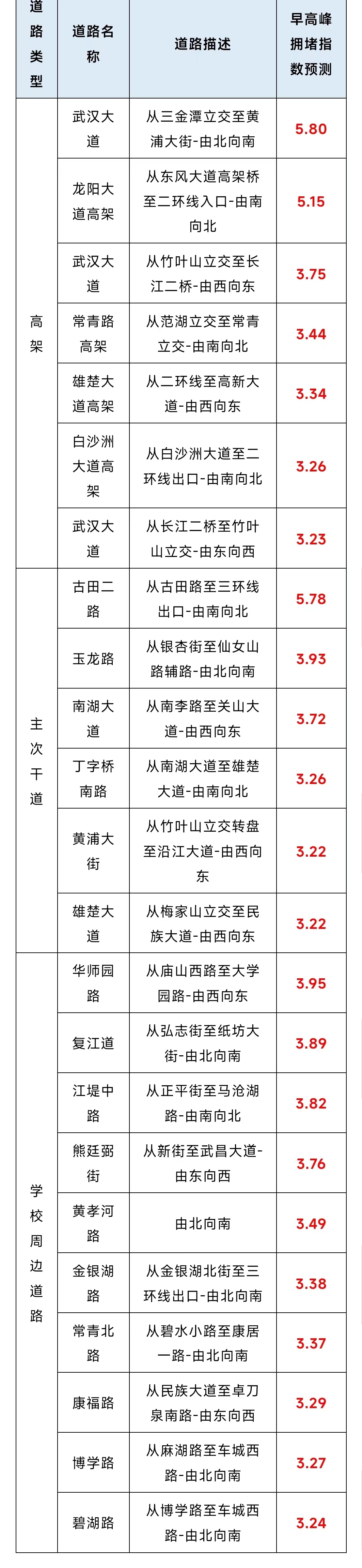 其中,解放大道、黄孝河路、东湖路、建设大道、友谊大道等城市主次干道,预计也将达严重拥堵状态,拥堵程度较近几个工作日上升50%以上。同时,桥隧中古田桥、知音桥、鹦鹉洲大桥、月湖桥、天兴洲大桥、二七长江大桥、白沙洲大桥早高峰拥堵延时指数也可能超过2.5,达严重拥堵状态。