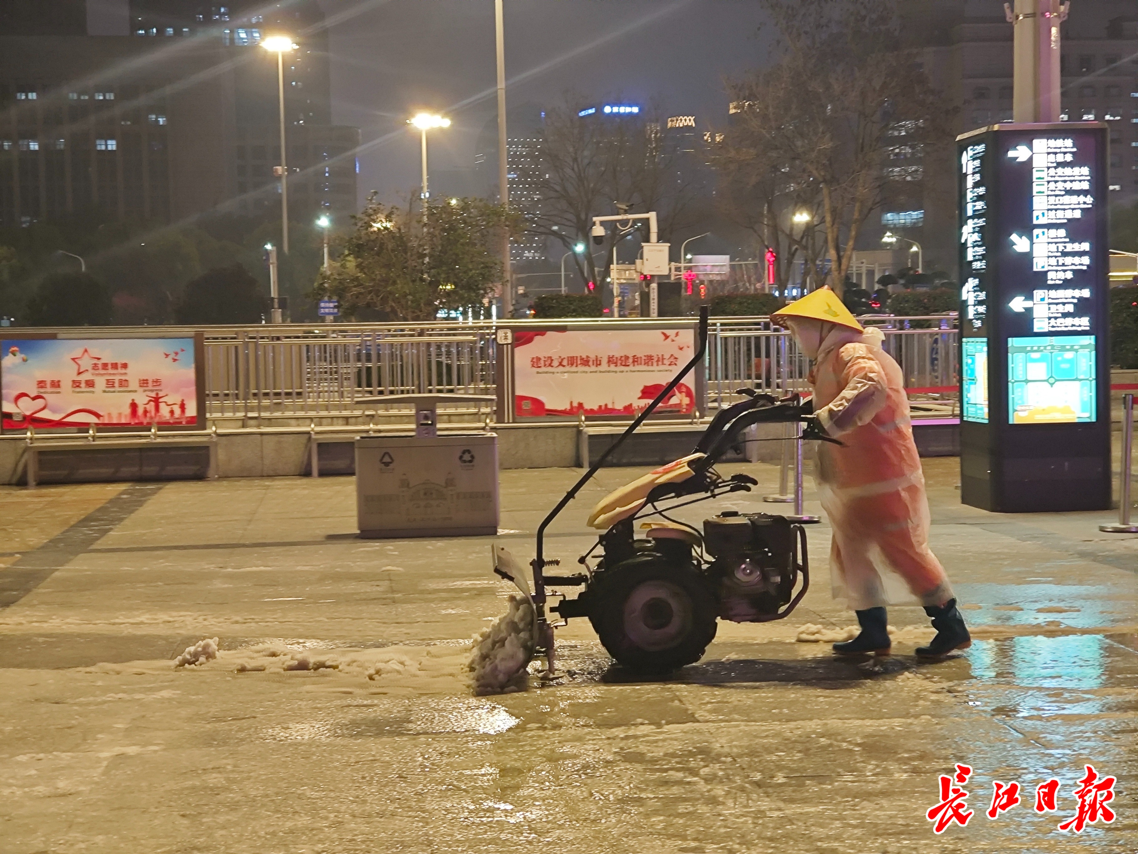 汉口站工作人员手推铲雪车清除路面冰雪。长江日报见习记者 陈星雨 摄