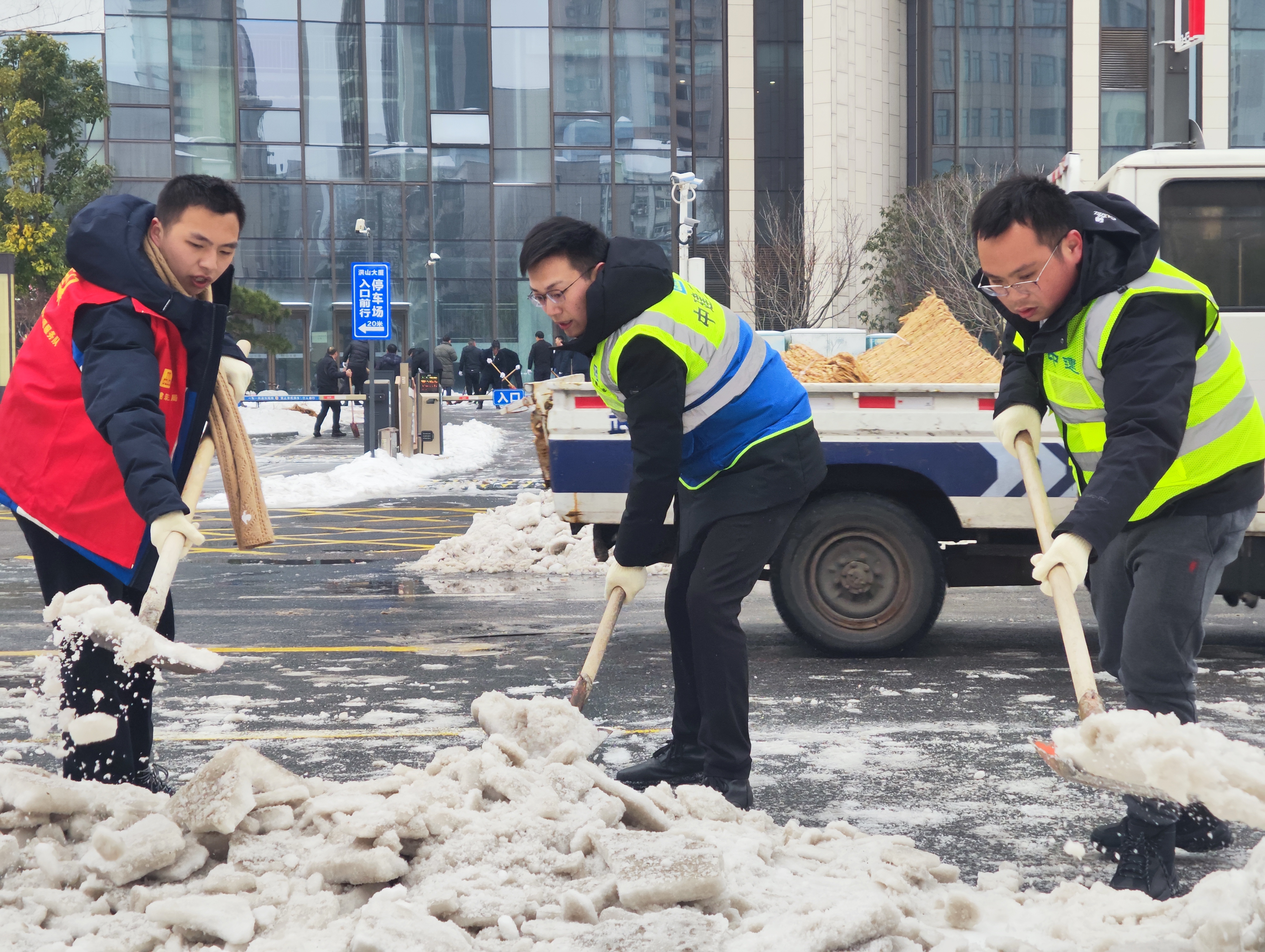 中建三局总承包公司党员突击队、青年突击队,带领100余名项目建设者,在洪山东一路附近开展融雪除冰。室外气温在0℃以下,湖北公司党员突击队队员耳朵被冻得通红,但大家毫无怨言,连续奋战,为附近居民出行清理出一条2公里的安全“温情路”。