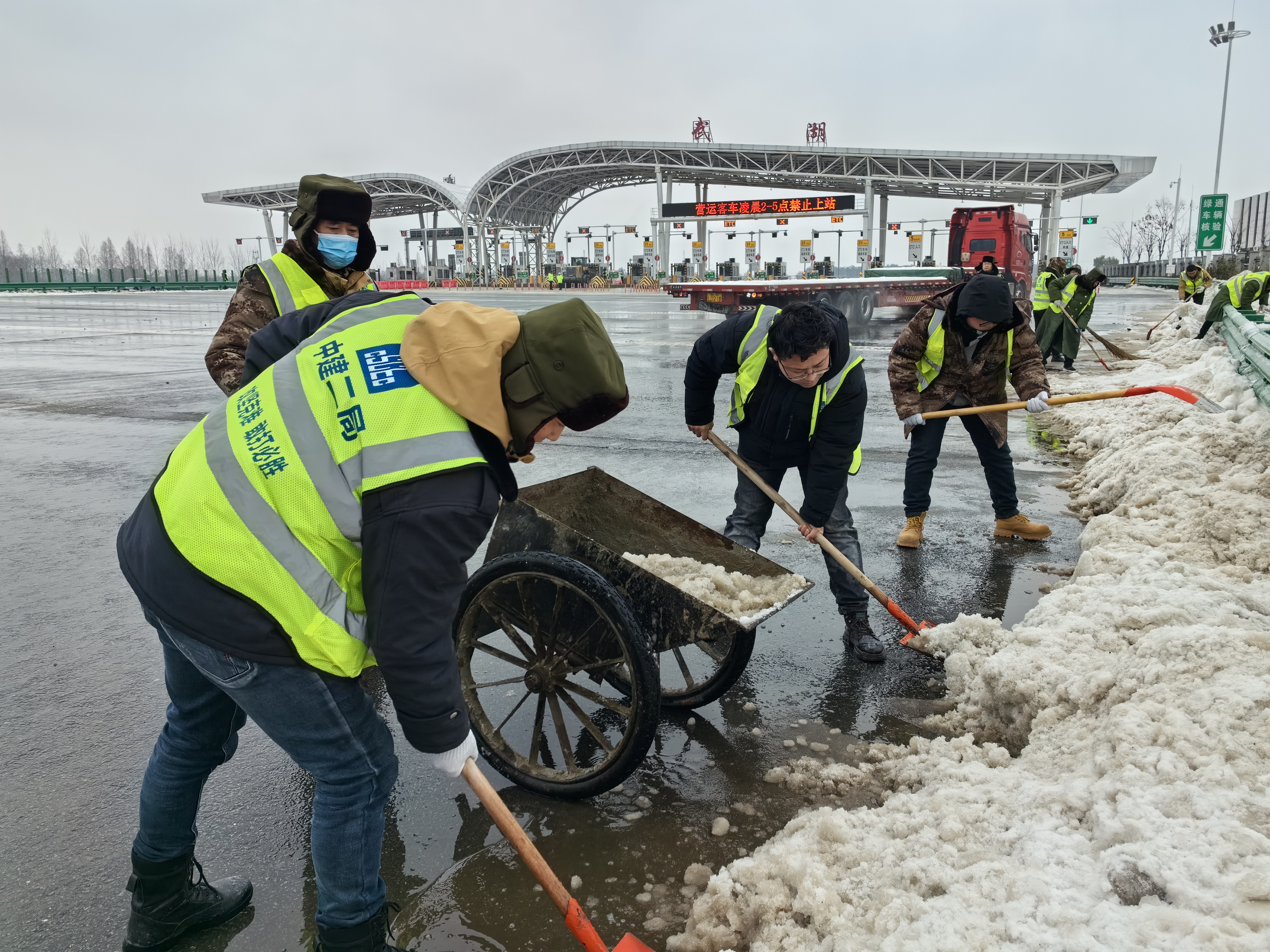 中建二局华中公司在高速出入口除雪。
