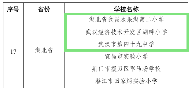湖北此次入选的6所学校有3所在武汉,包括2所小学:湖北省武昌水果湖第二小学、武汉经济技术开发区湖畔小学;1所中学:武汉市第四十九中学。