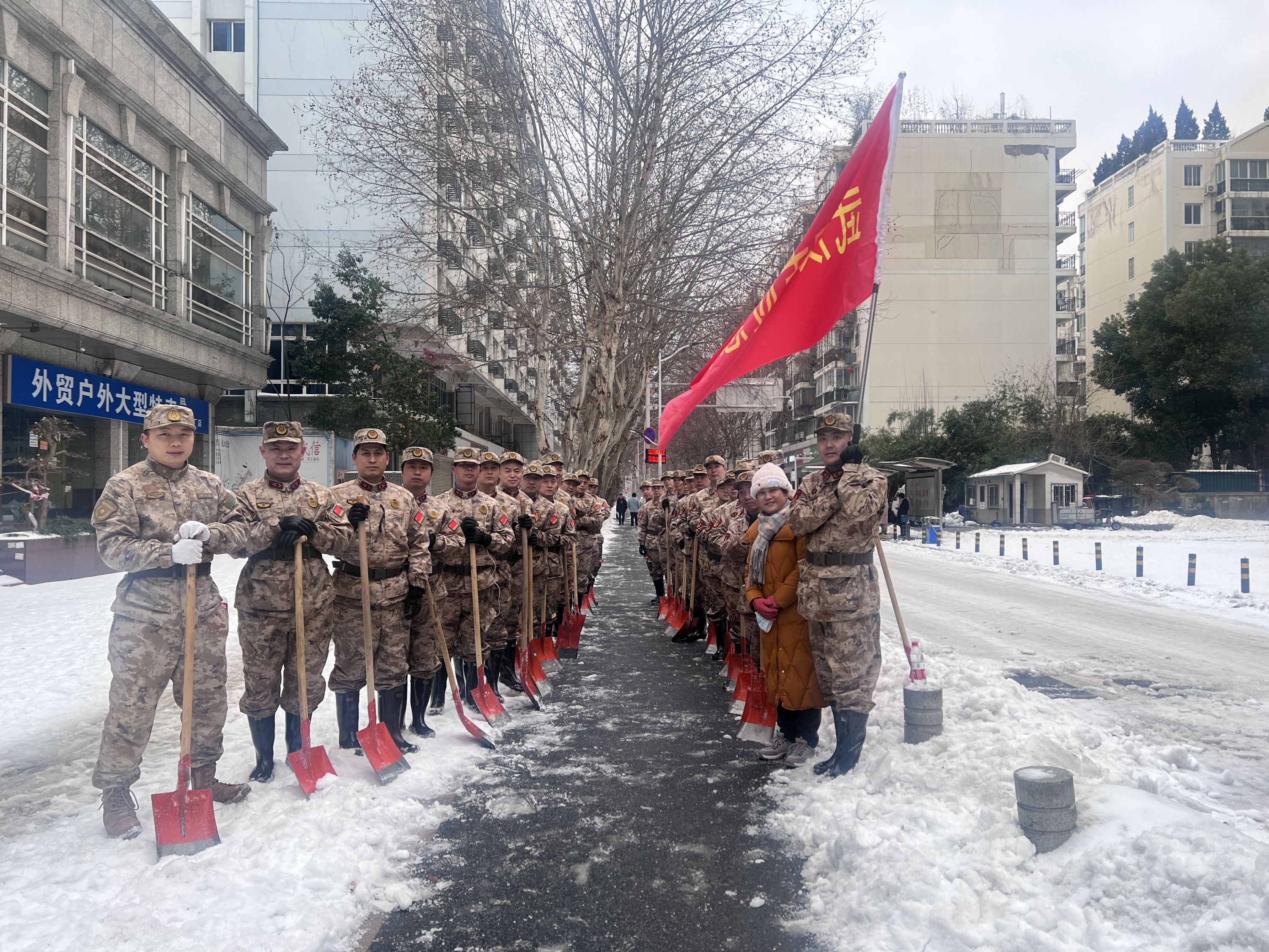 长江日报大武汉客户端2月24日讯 在关键时刻,体现国有企业的责任和担当。两天时间,除雪三条街道,畅通社区居民出行。2月22日至23日,湖北港口集团所属企业武港集团20余名民兵火速集结,赶赴江汉区万松街道航侧社区开展除雪保畅行动。