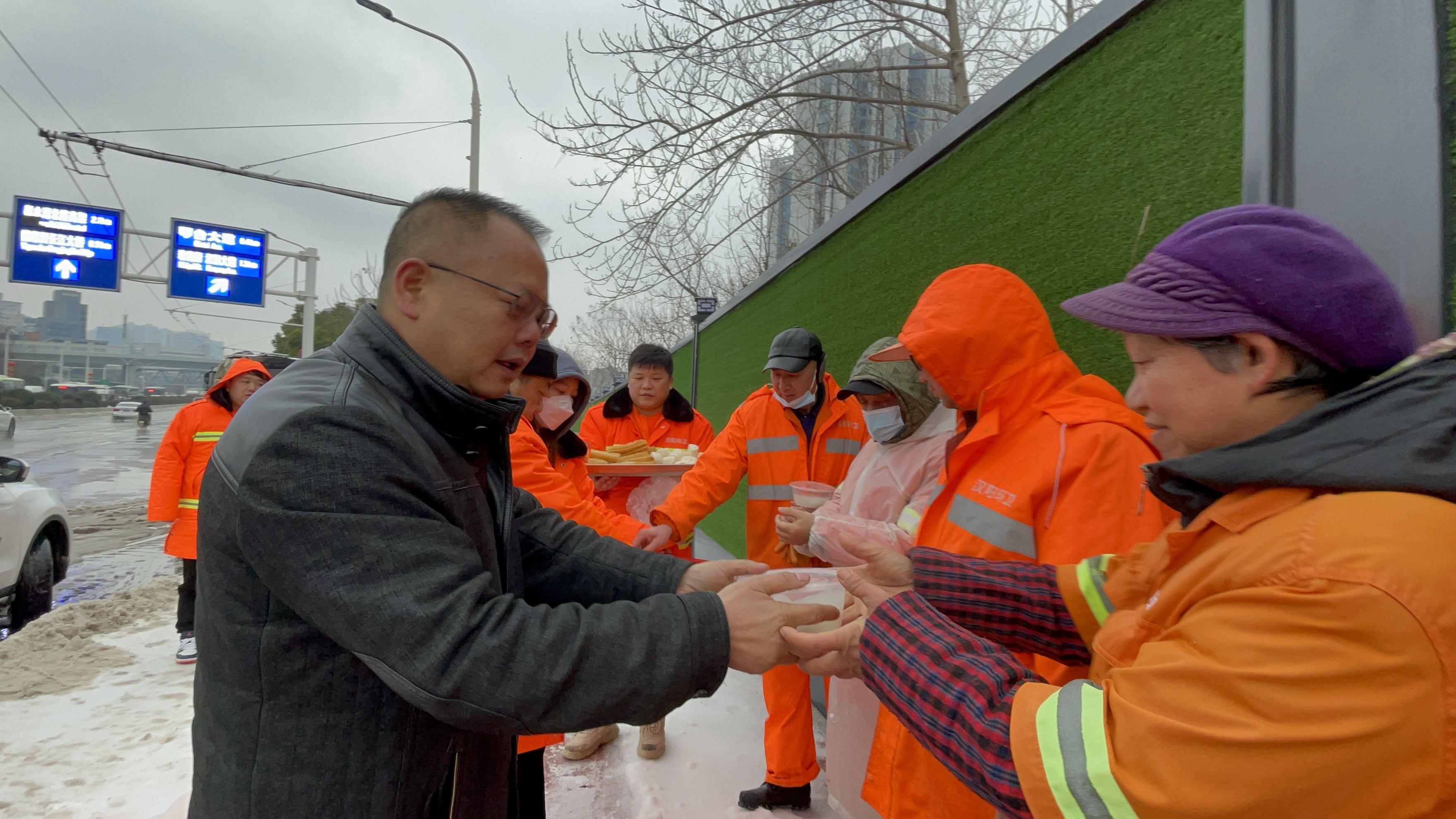 据汉阳环卫集团总经理吴永忠介绍:“昨晚,我们的职工通宵在长江大桥、杨泗港长江大桥、二环线、汉蔡路、郭琴路、连通港路等重要路段进行铲雪除冰作业,力争尽快还道路本色。今天是元宵佳节,他们依然坚守在一线岗位上。所以,我们特意准备了用姜水煮的汤圆,驱寒护胃,感谢他们连日来为守护城市的辛勤付出。”