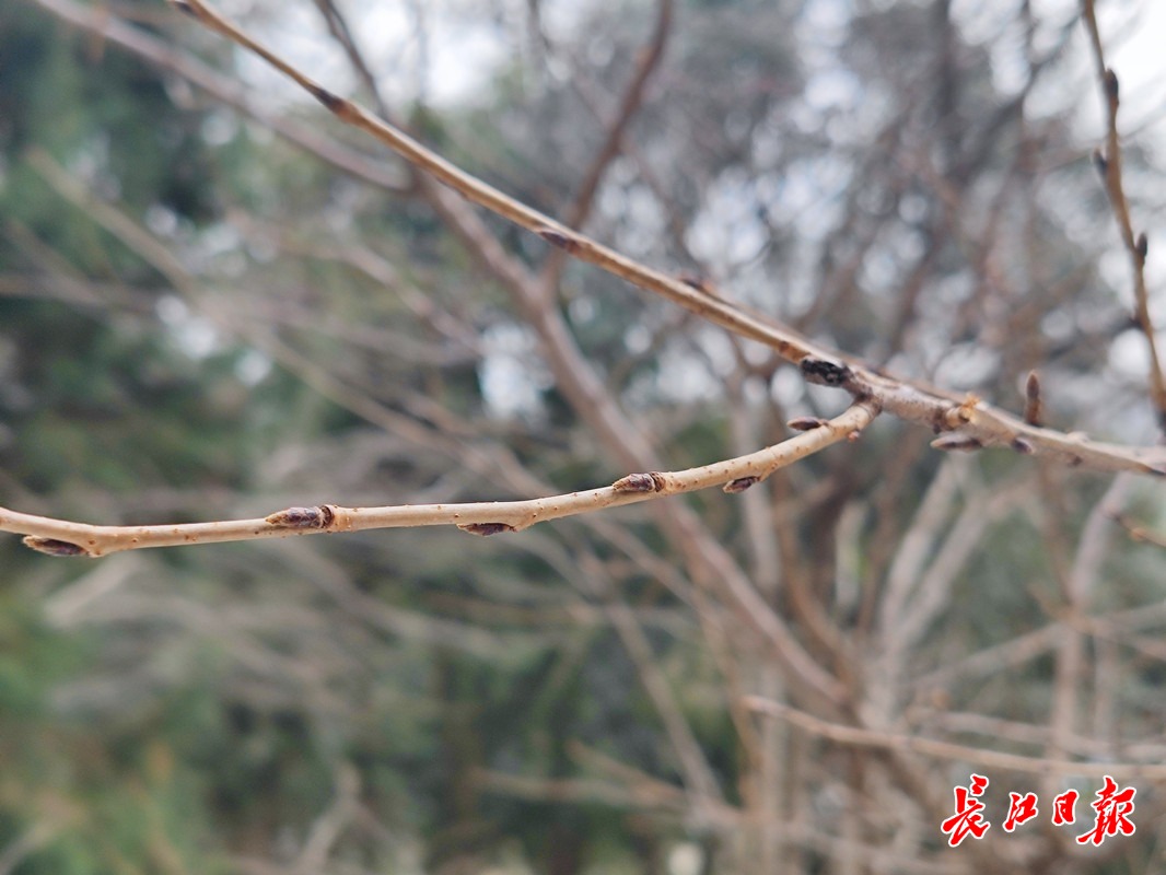 武汉大学的樱花树,花苞如米粒般大小,暂未开花。记者汪洋 摄