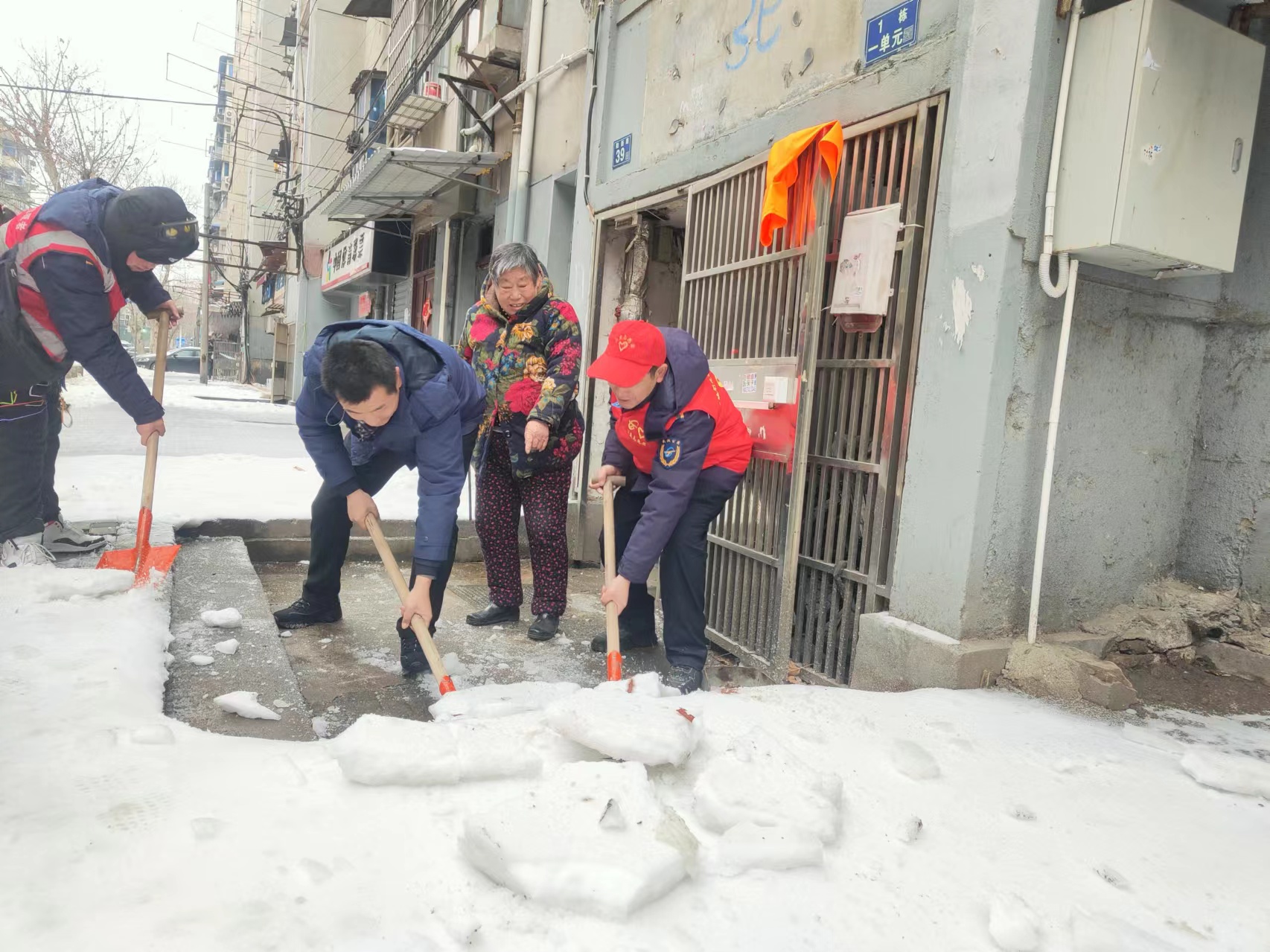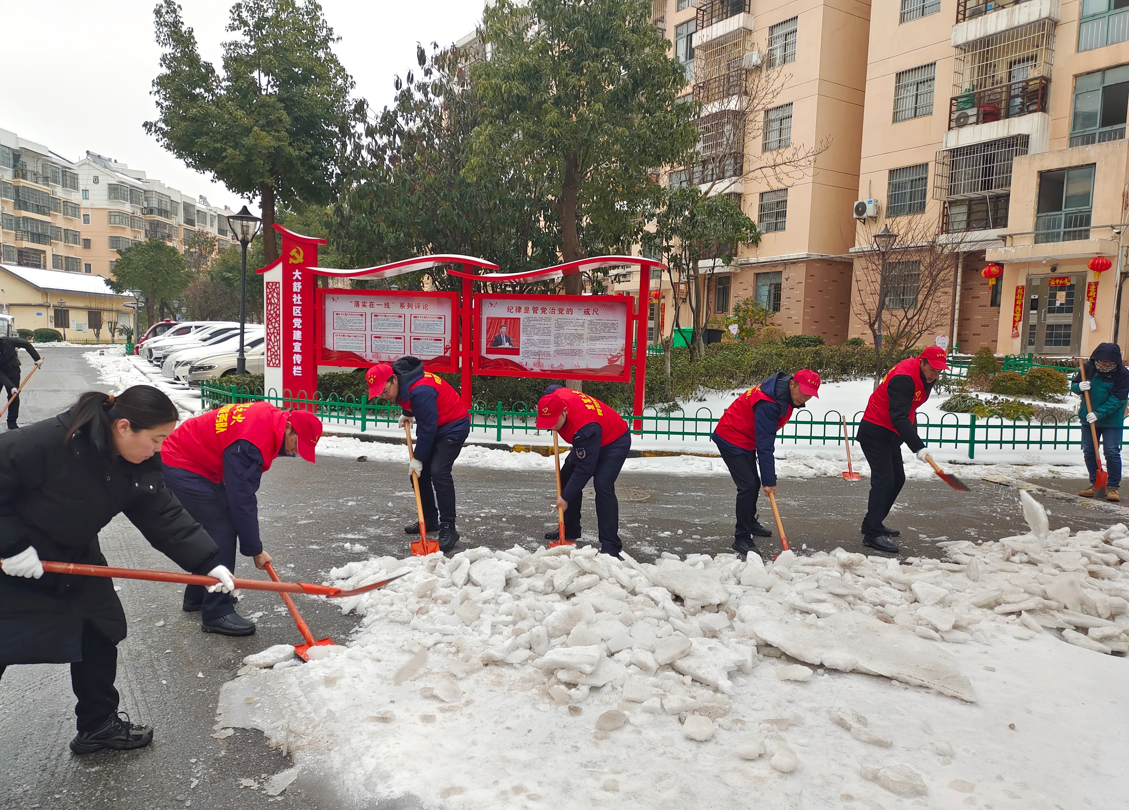 公交志愿者在龙阳街道汉城社区开展铲冰除雪志愿服务。通讯员供图