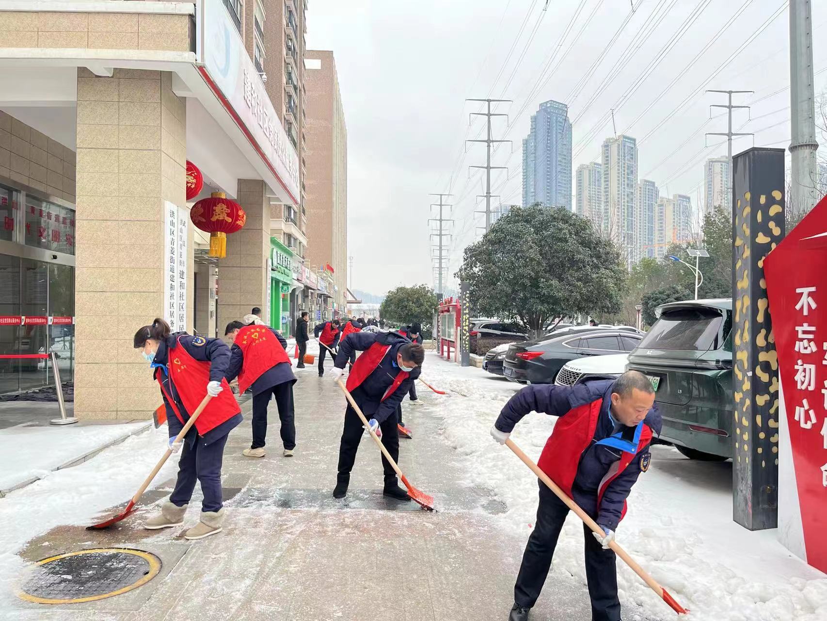 公交志愿者在洪山区建和社区开展铲冰除雪志愿服务。通讯员供图