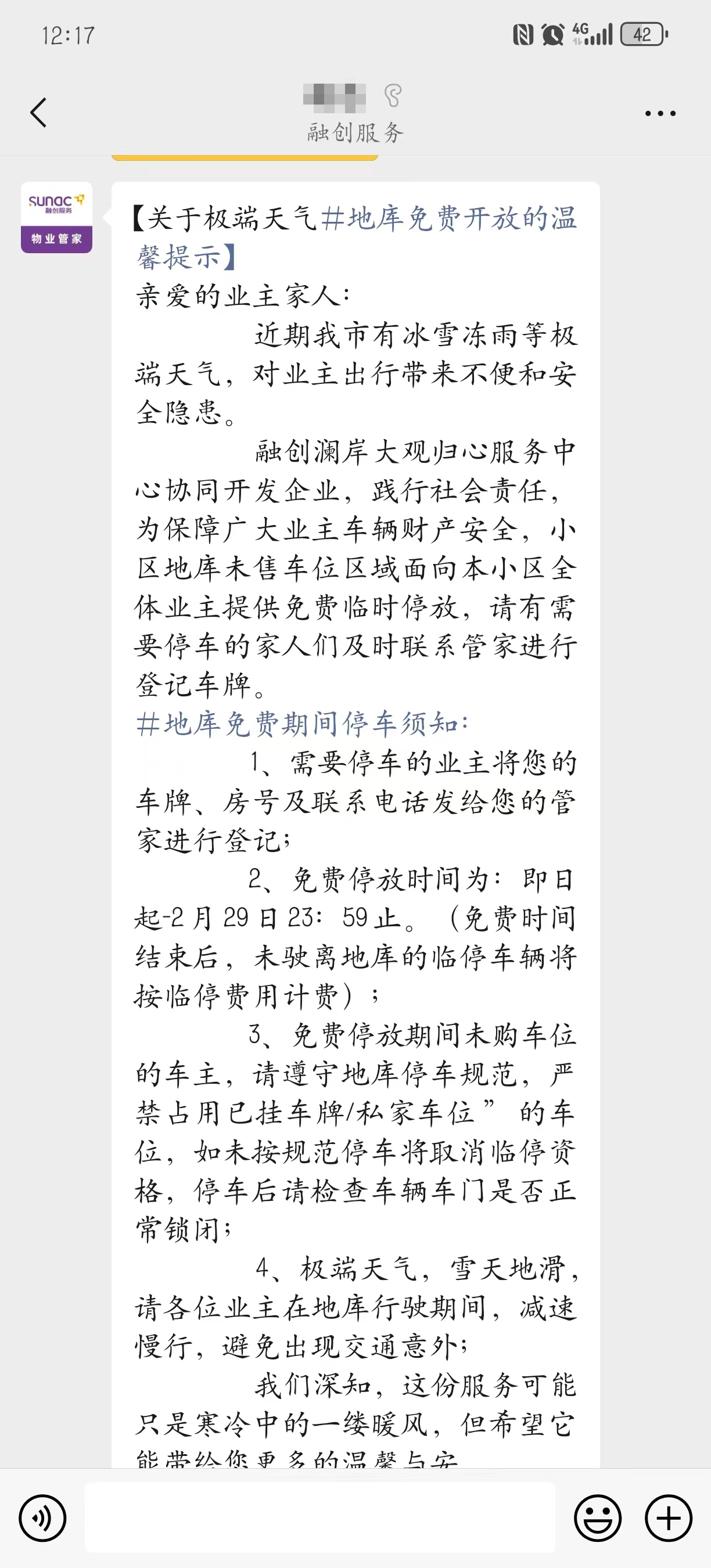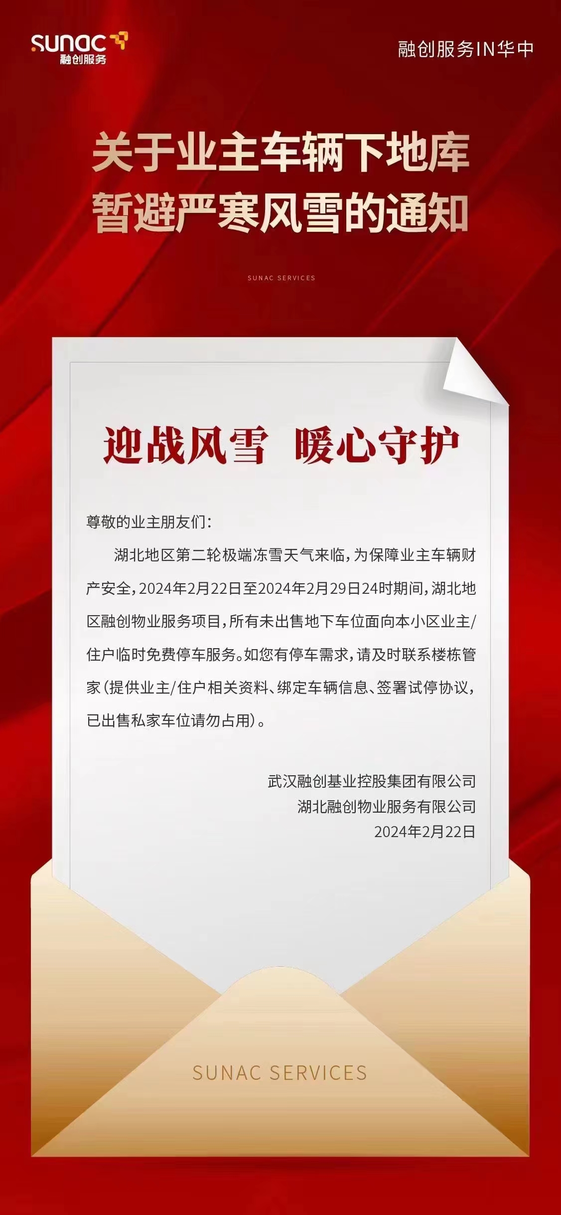 长江日报大武汉客户端2月25日讯(记者杨荣峰 尹勤兵)“物业管家点对点给我发消息,说免费停车,真的是不漏一人。”22日,家住鄂州融创澜岸大观的胡先生的物业管家发来微信消息,小区地库未售车位区域面向本小区全体业主提供免费临时停放。胡先生说,21日,鄂州开始下冻雨,第二天,小区物业就将地库免费开放。