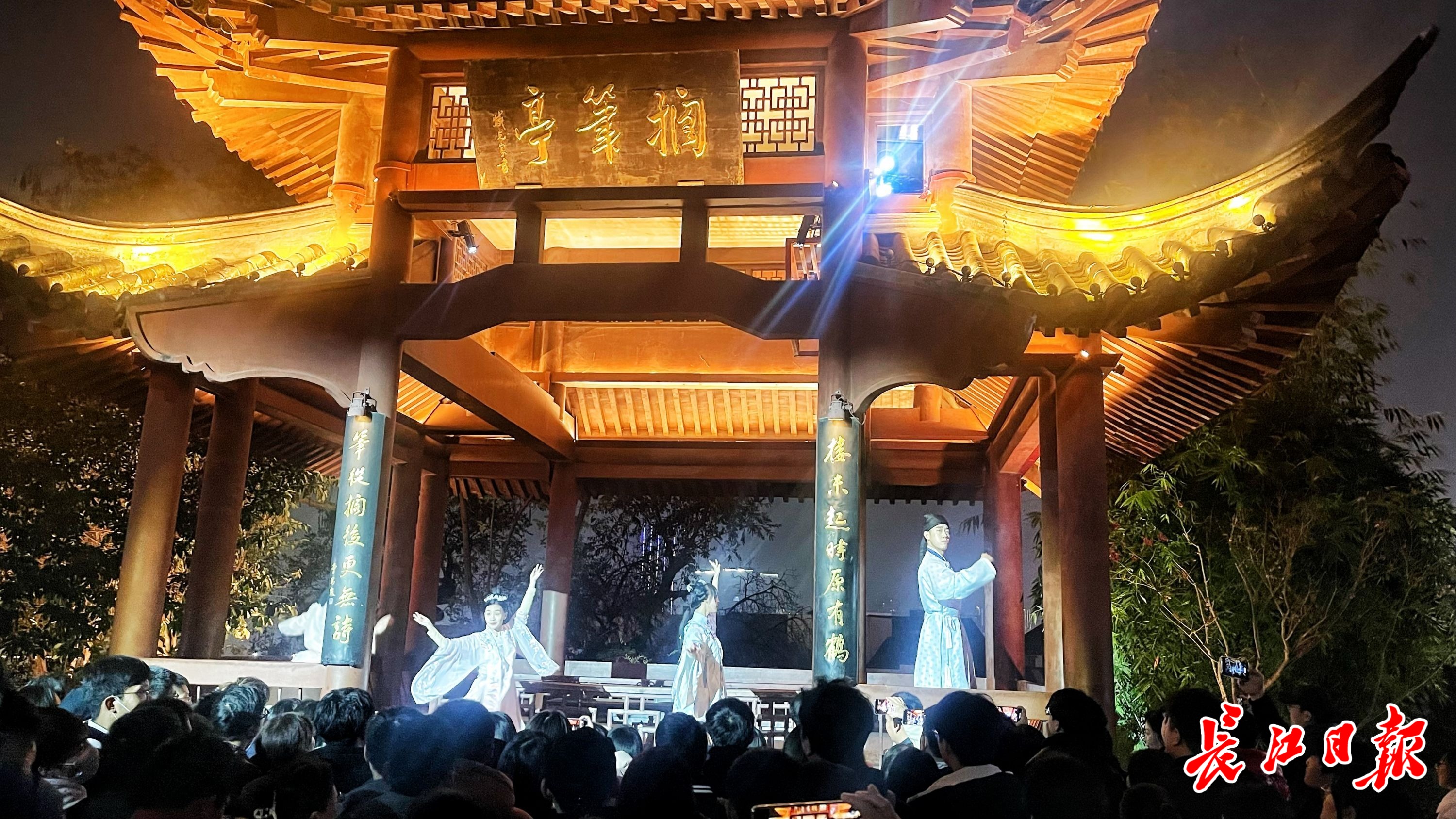 身着汉服的演员们在搁笔亭下吟诵着唐代诗人崔颢的《黄鹤楼》。记者何晓刚 摄