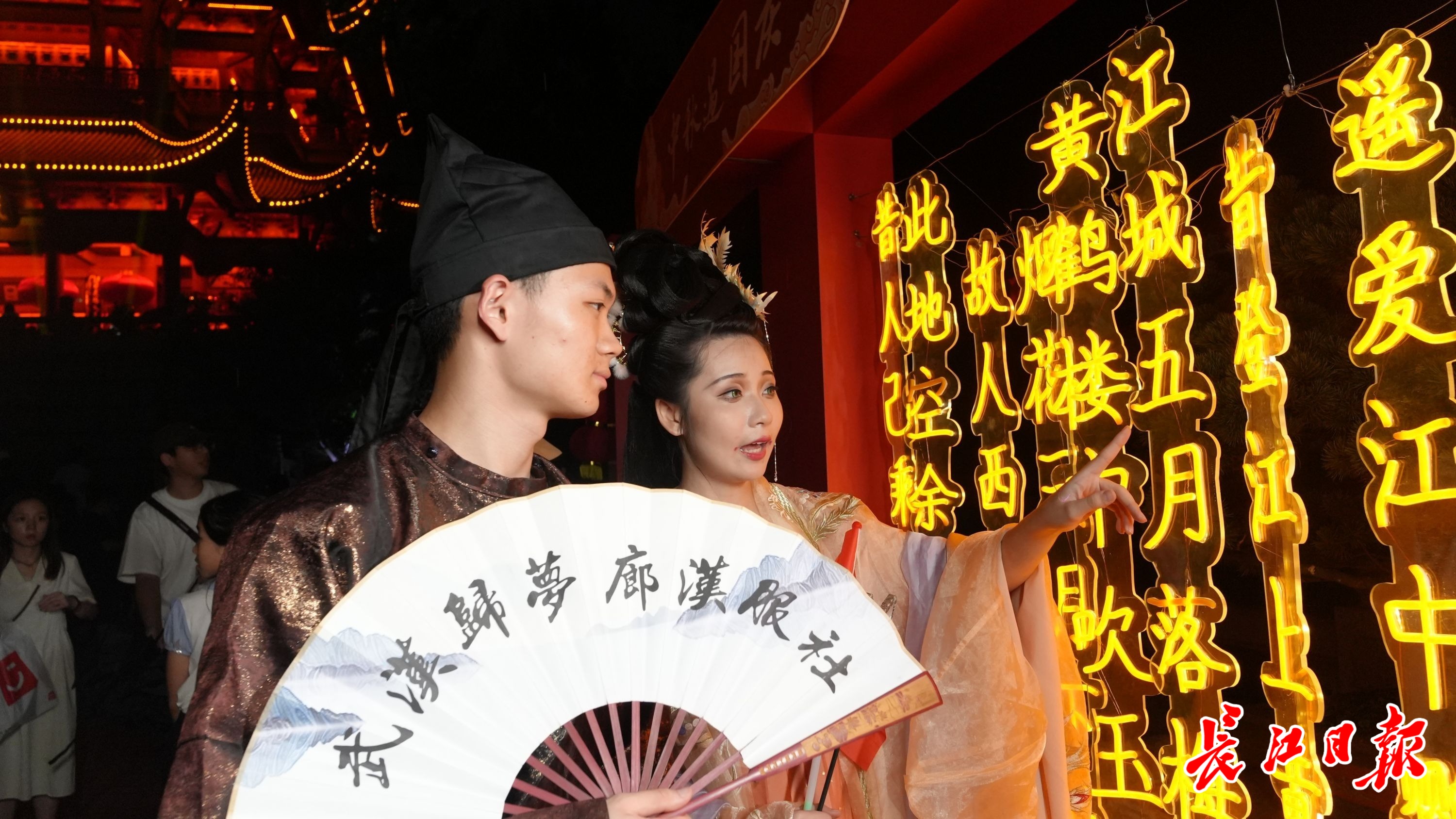 长江日报记者此前曾多次探访《夜上黄鹤楼》。夜幕降临,在光影交错中黄鹤仙子翩翩起舞引人入胜,拾级而上,在诗碑廊处、搁笔亭下身着汉服的演职人员展现黄鹤楼的诗意画卷。据了解,《夜上黄鹤楼》以“光影+演艺”的方式,通过激光投影、激光动画、高压水雾等众多高科技光影技术,搭配现代声、光、电,以及动画光影特效,打造出辛氏沽酒、仙子起舞、黄鹤楼变迁等沉浸式故事场景,让游客能身临其境去感受黄鹤楼的历史渊源和隽永的意境。