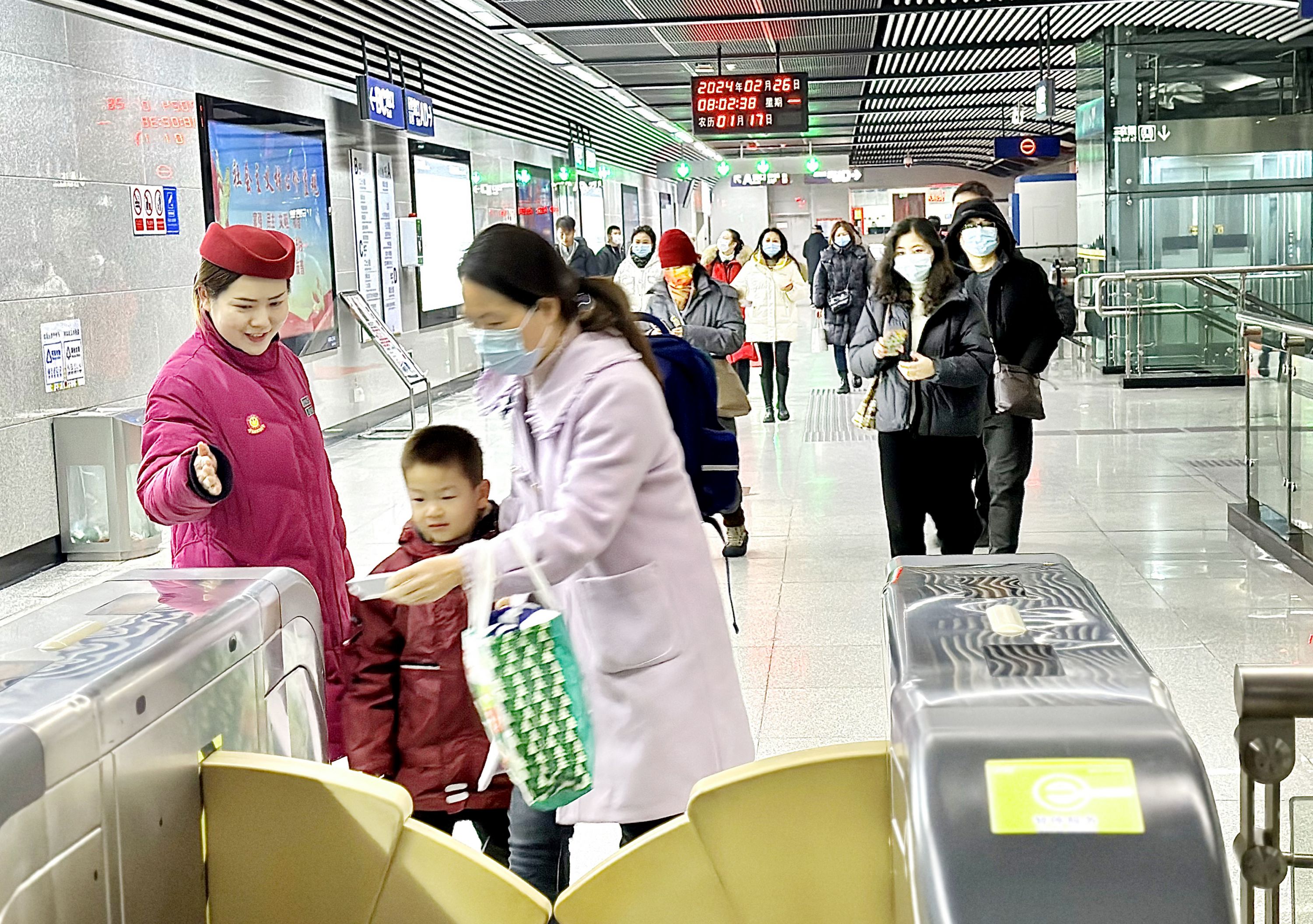 “我们车站空间大,布局较为复杂,为此在D、E厅出站闸机处设立了安全接送点,目的是方便学生和家长在此会合,高峰时段还设了专岗引导乘客。”熊天行介绍,早高峰时段,学生、通勤以及到医院就医的乘客较多,换乘客流也随之增大。