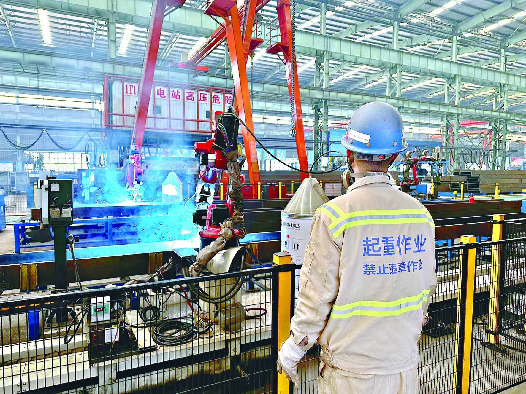 中法生态城中建钢构武汉厂,智能地轨焊接机器人正在作业。