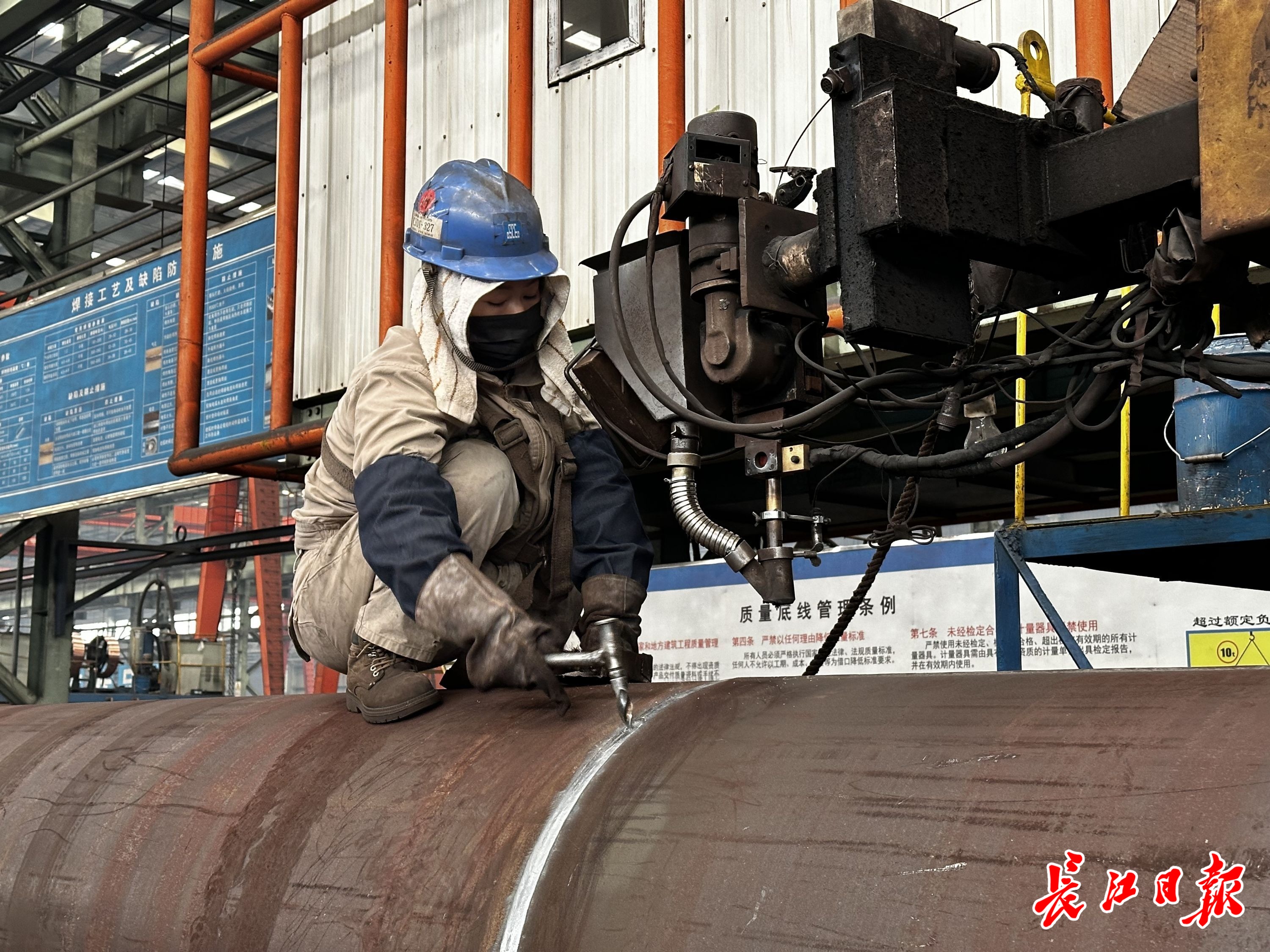 李云飞蹲在钢构圆管上作业。 长江日报记者张衡 摄