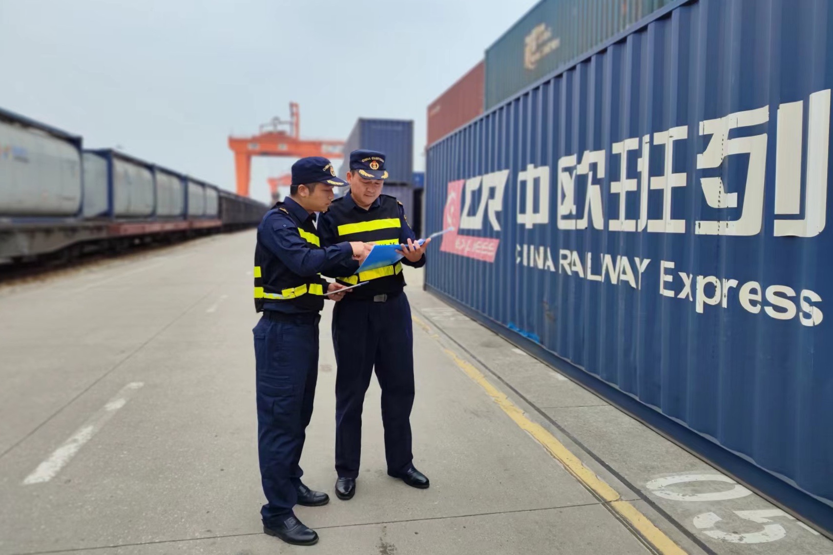 汉口海关关员现场监管中欧班列货物。通讯员张令子 摄