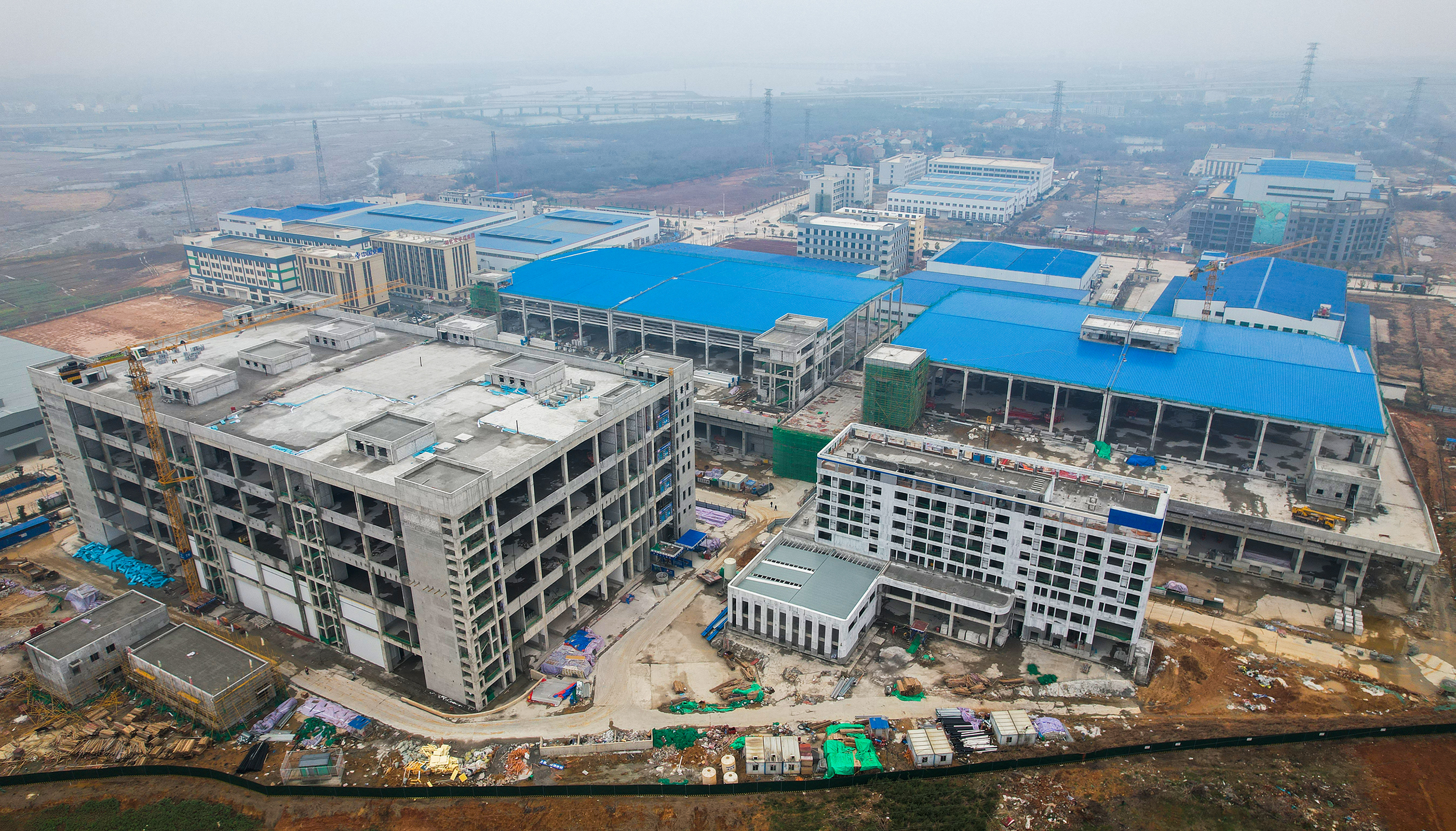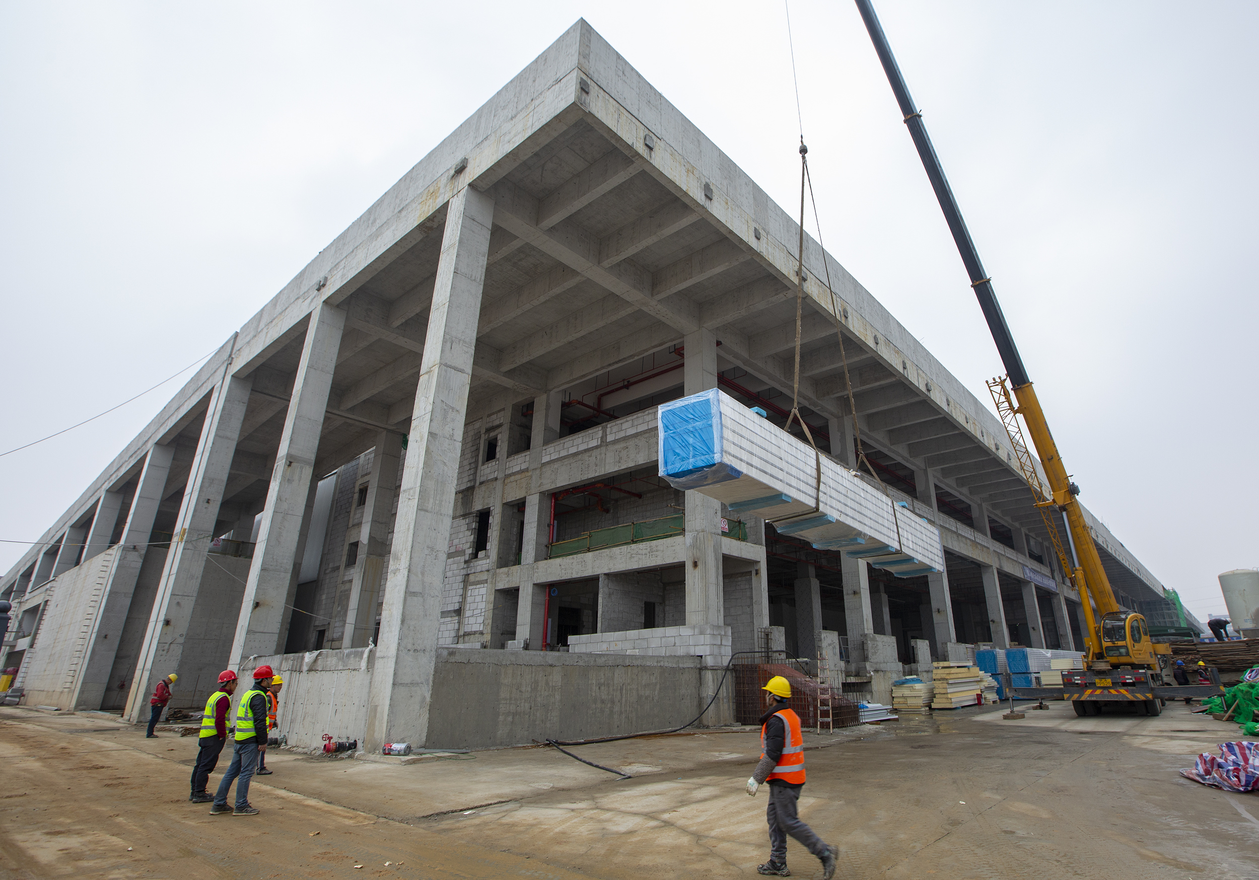 长江日报记者在施工现场看到,塔吊将保温板吊装到指定楼层后,施工人员来回运输、铺装着保温板,一百多台登高车同时在各个楼层作业。楼下十余台挖掘车和铲车穿梭于道路工程及园林工程之间。