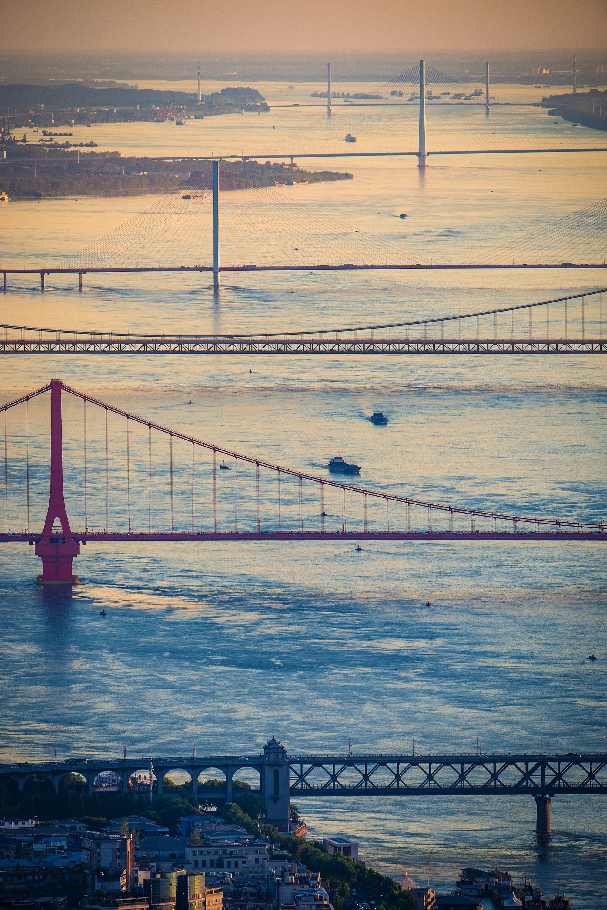 武汉长江大桥与武汉鹦鹉洲长江大桥、杨泗港长江大桥、白沙洲长江大桥、军山长江大桥、沌口长江大桥同框。长江日报资料图