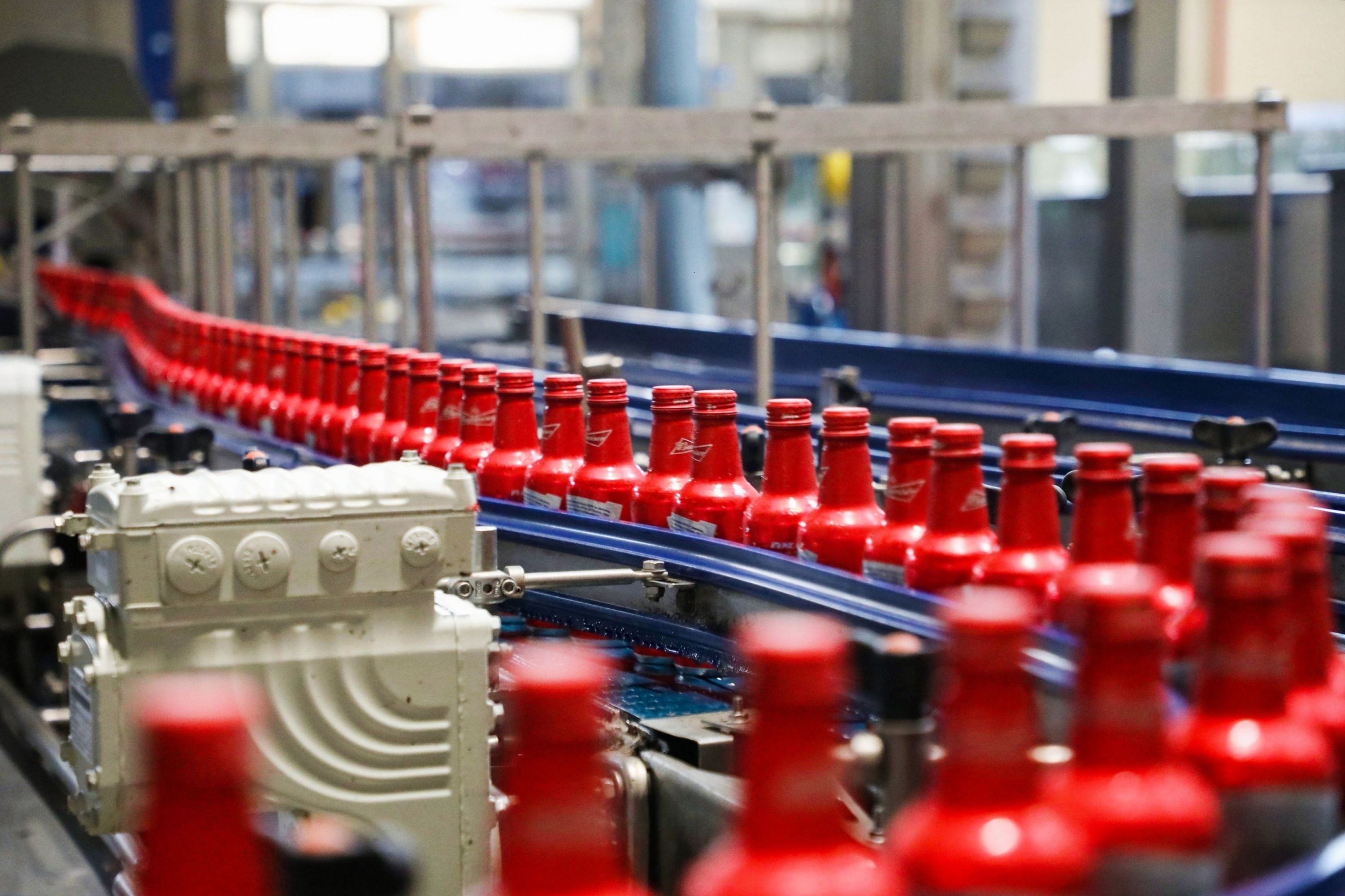 一瓶瓶啤酒产品正在百威武汉工厂快速生产下线。
