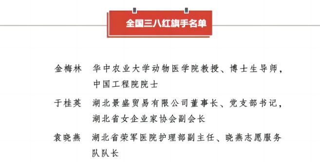 全国妇联公布了2023年度全国三八红旗手标兵、全国三八红旗手、全国三八红旗集体。其中,武汉市3名全国三八红旗手、1个全国三八红旗集体光荣上榜!