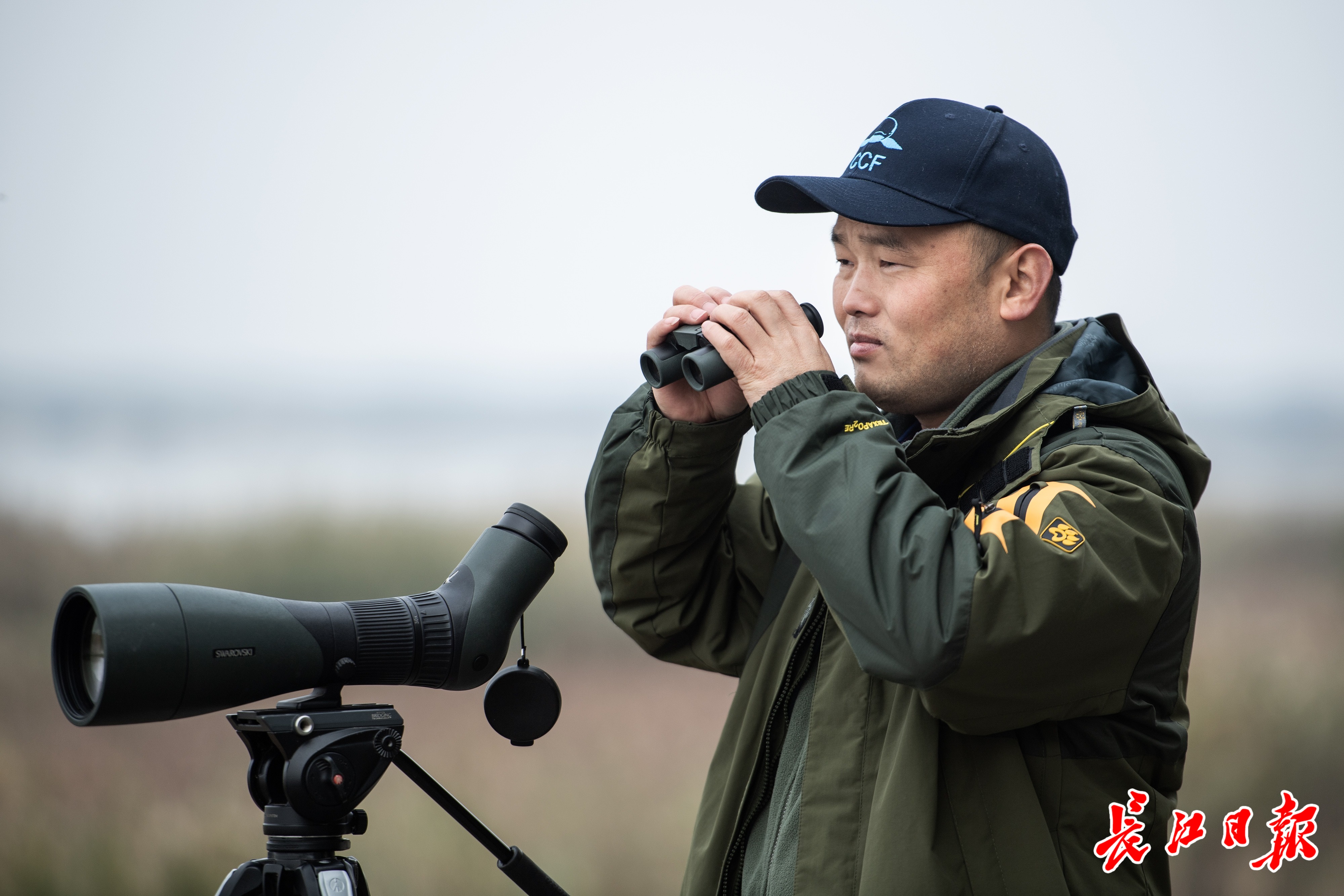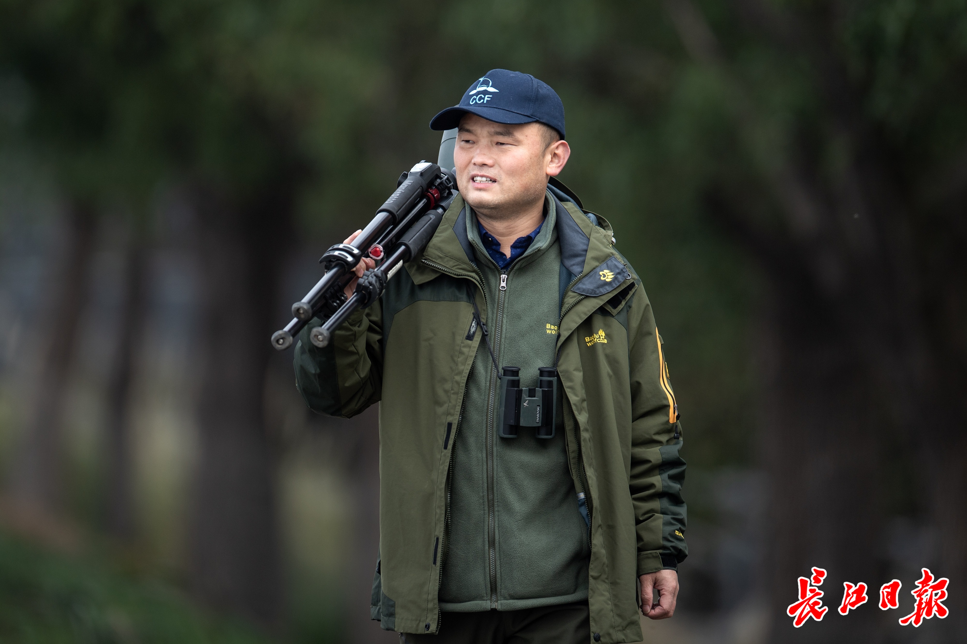 冯江肩扛“长枪短炮”进行鸟类监测和调查。记者任勇 摄