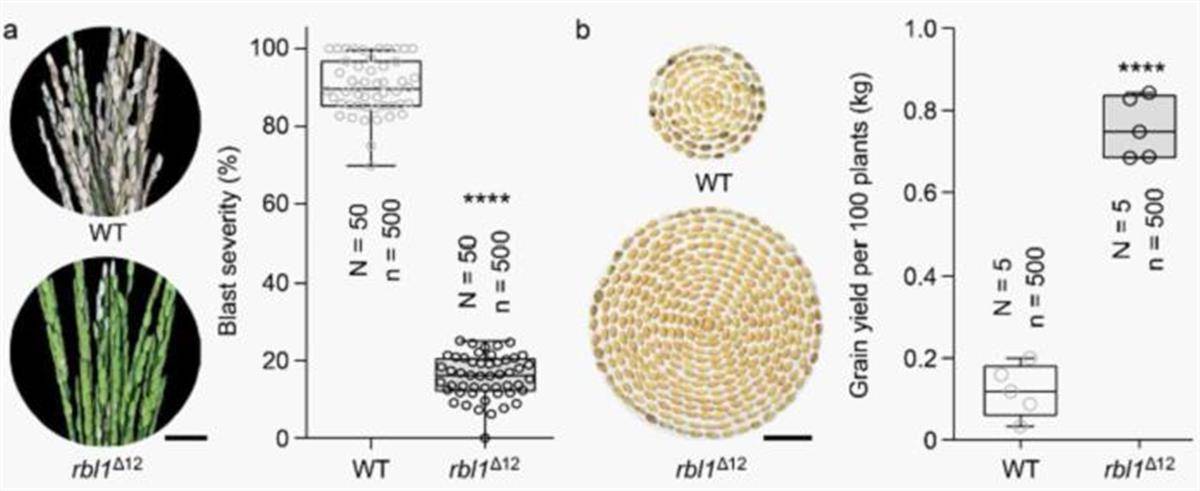 稻瘟病、稻曲病和白叶枯病等常年造成水稻减产及品质降低,培育和种植抗病品种是作物病害绿色防控最为经济有效的措施。华中农业大学李国田教授团队,利用基因编辑技术创制了平衡广谱抗病性与产量的新基因RBL1Δ12,该基因显著增强对稻瘟病、白叶枯病和稻曲病抗性且不影响产量,在田间可提高稻瘟病抗性等级3级,病害发生时可减少约39%的产量损失。该基因在作物中高度保守,与传统抗病基因相比能够打破物种界限、快速推广至其他作物的优势,具有巨大抗病育种应用潜力,对保障国家粮食安全有重要意义。