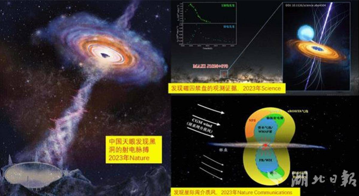 武汉大学物理科学与技术学院天文学系王伟教授和游贝教授团队,利用中国大型天文望远镜发现了黑洞辐射的新现象,直接揭示黑洞附近物质的运动和辐射规律,极大促进黑洞物理和相对论天体物理的研究。团队对黑洞系统开展高精度的射电光变监测,首次观测到黑洞亚秒级的射电准周期振荡的现象,并揭示该现象与相对论性喷流直接相关,打开黑洞射电观测新窗口;利用中国慧眼科学卫星,首次观测到黑洞磁囚禁吸积盘(MAD)形成的证据,揭示了黑洞热吸积流中的磁场输运过程,有助于理解吸积盘大尺度磁场形成机制和MAD中的物理过程;研究了银河系中心四百万个太阳质量的超大质量黑洞在一千万年前的活跃特征,首次揭示星系周介质相对于银河系存在明显的横向运动,从而影响银河系的演化。