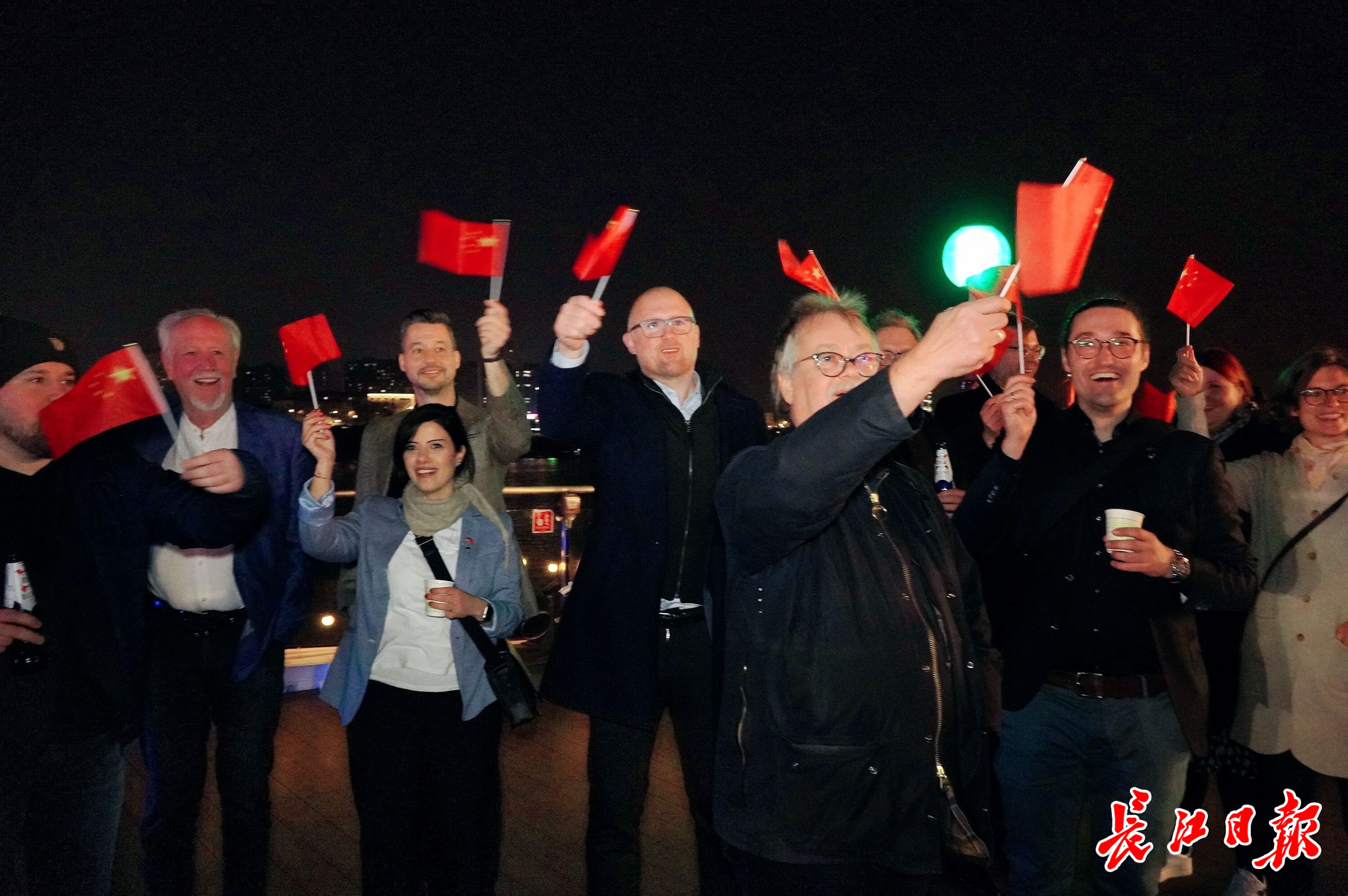 夜游长江时,索伦·林克市长(左五)和德国代表团成员挥舞中国国旗。长江日报记者夏俊俊 摄