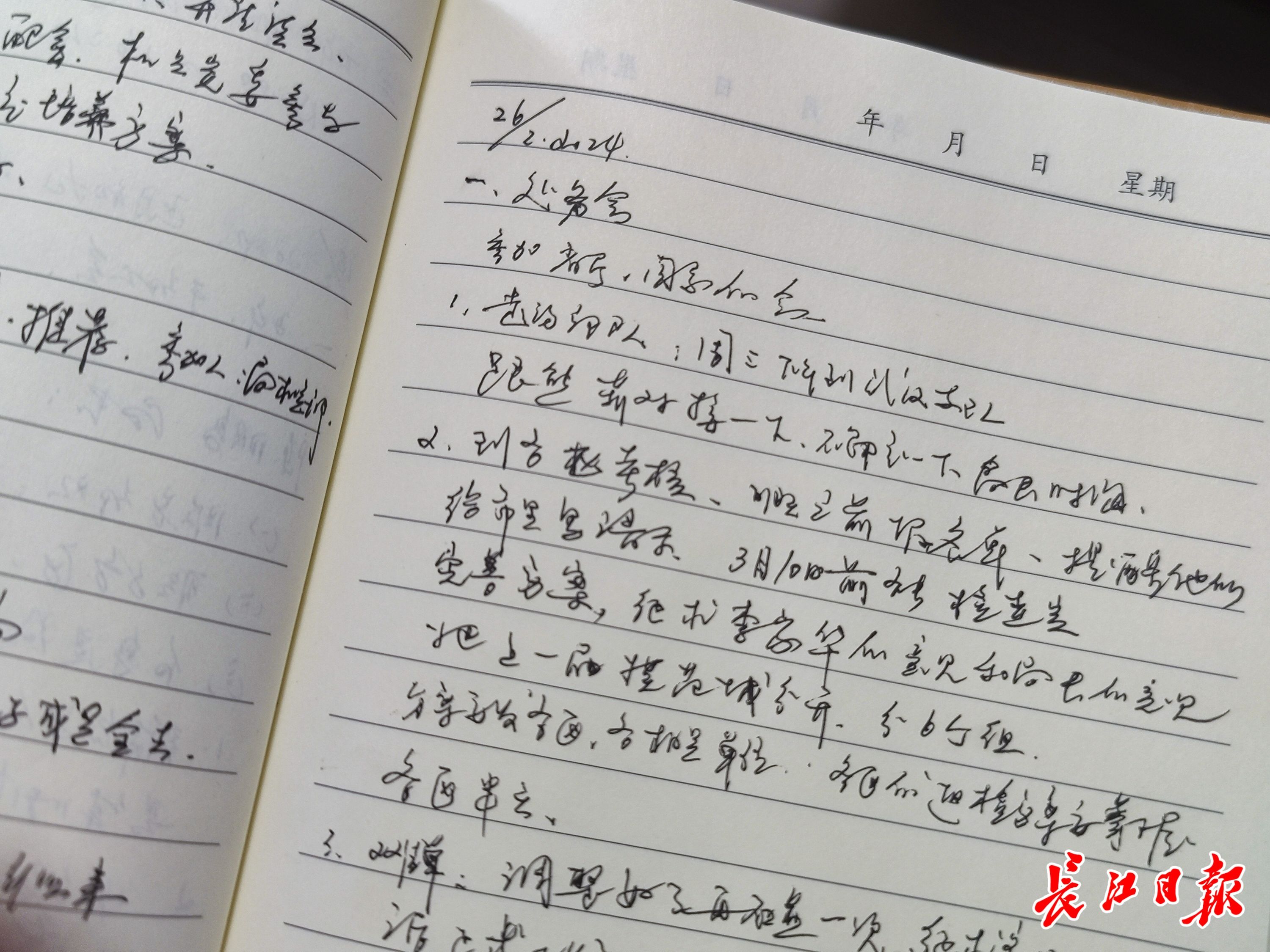 钱锋工作的记录本,停留在2月26日的会议工作内容记录。长江日报记者胡冬冬 摄