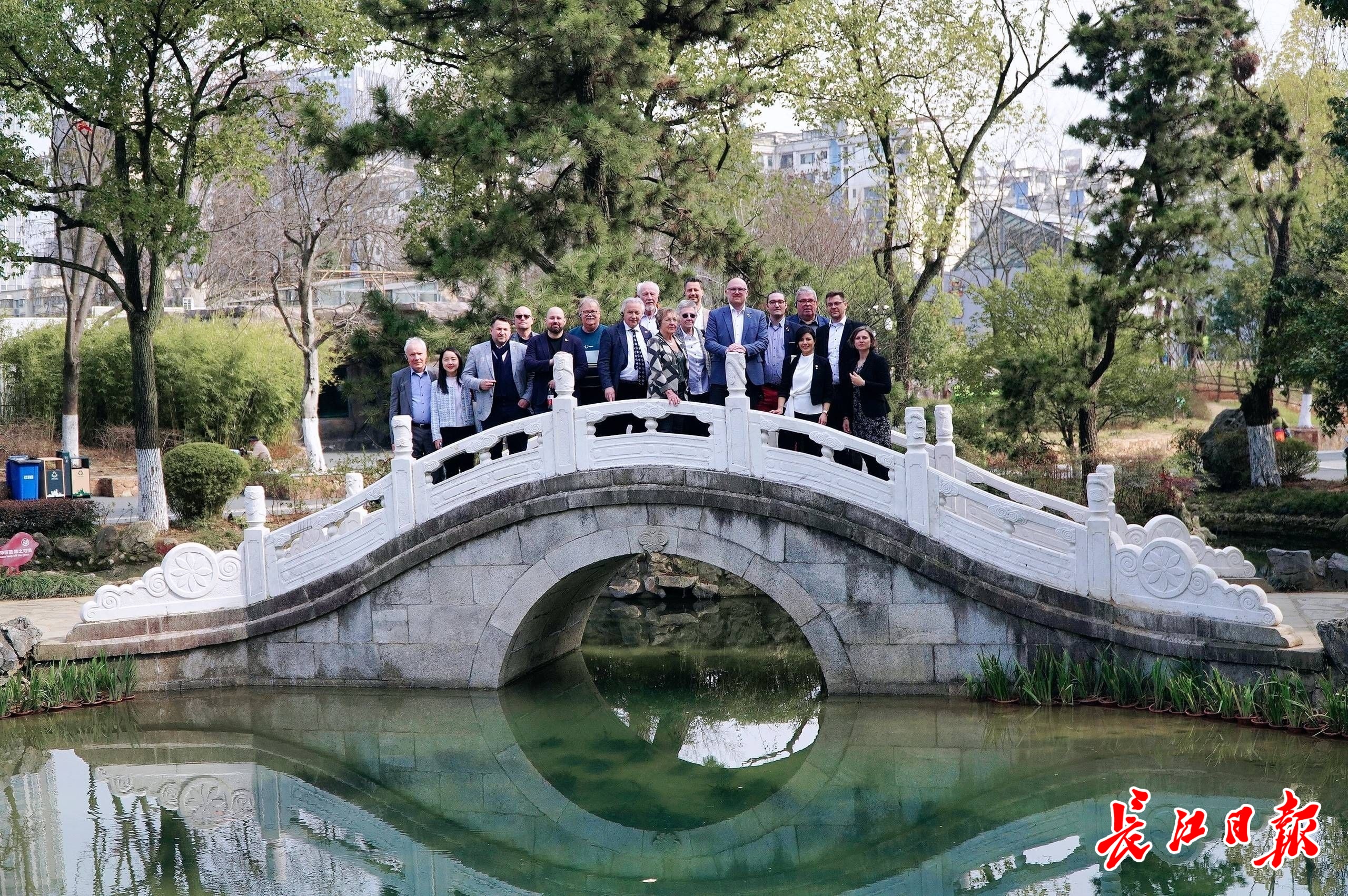 代表团成员在郢趣园的石桥上合影。 长江日报记者夏俊俊 摄