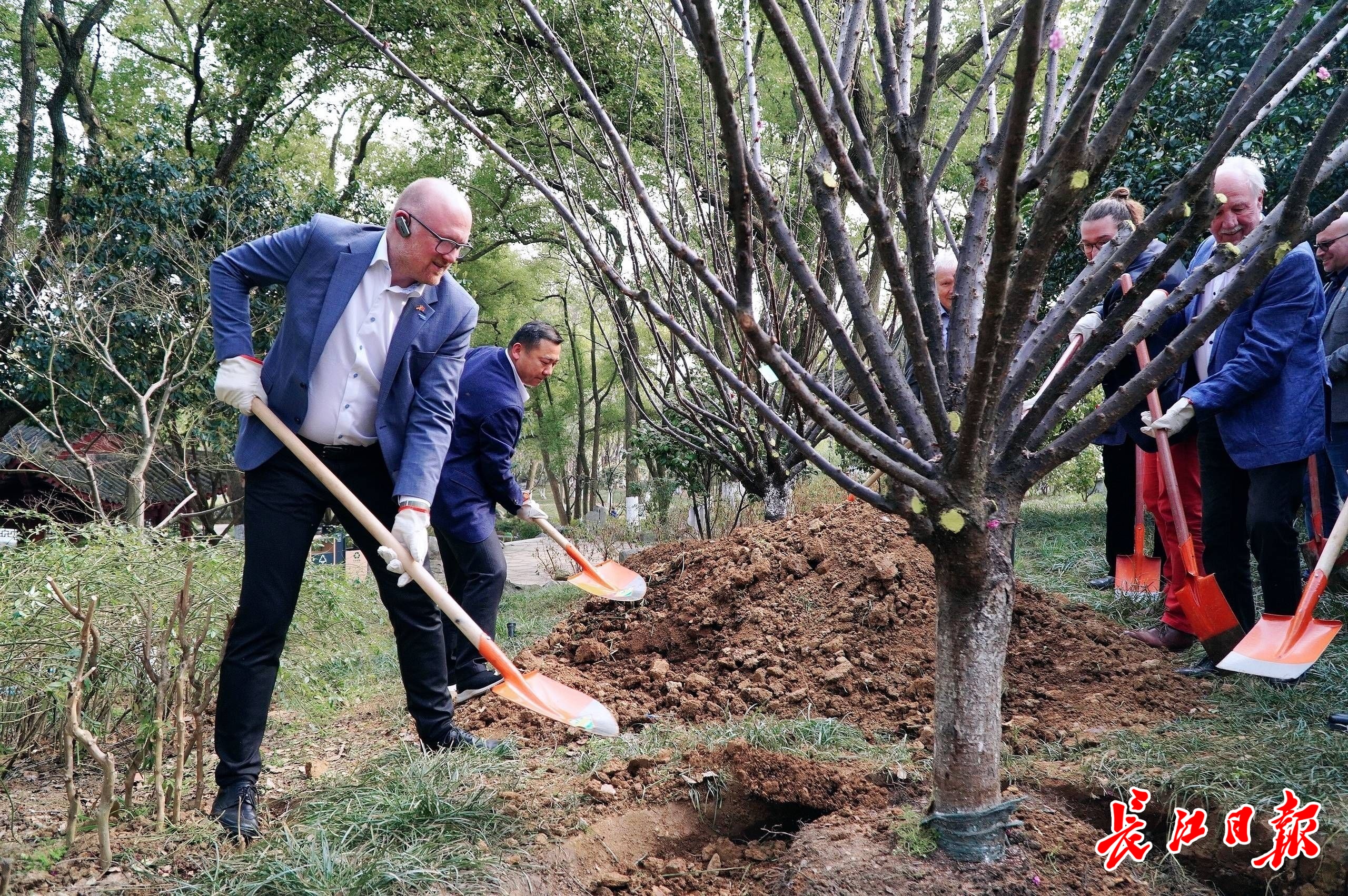 长江日报大武汉客户端讯 3月12日,武汉国际友城德国杜伊斯堡市市长索伦·林克携代表团到访位于蔡甸区的中德产业园寻求“知音”,走进位于武汉市动物园的两市园林友好合作项目郢趣园,种下两棵象征友谊的梅树。