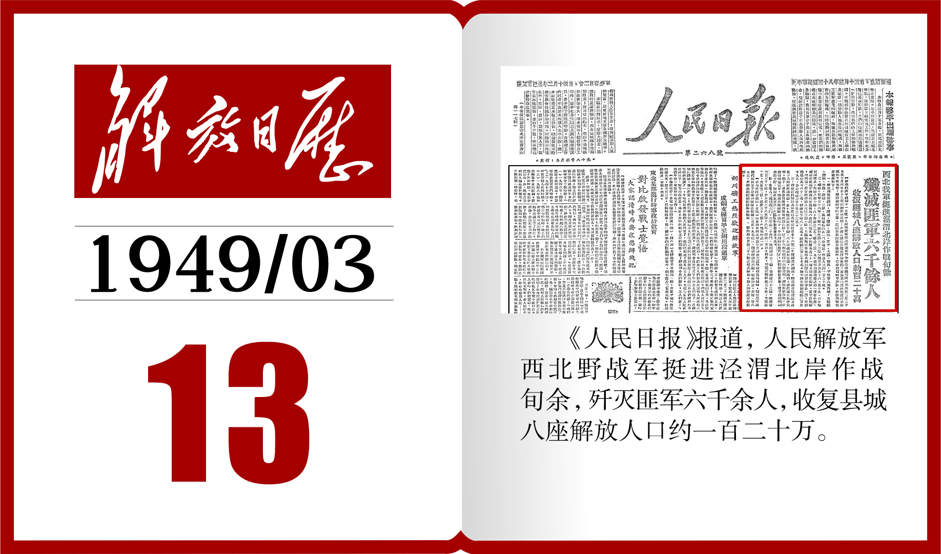1949年的今天,《人民日报》报道,西北野战军挺进泾渭北岸作战旬余,歼灭匪军六千余人丨解放日历 ©原创 2024-03-13 16:08 0 图片来源:人民日报 整理:曹欣怡 设计:陈昌 制作:张莉 【编辑:邓腊秀】