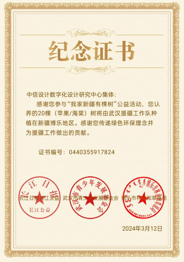 在武汉,3月12日,武汉“青年文明号”、中信设计数字化设计研究中心集体认种了20棵苹果树,并将这片新生的林地命名为中信设计数字化设计研究中心青年林。