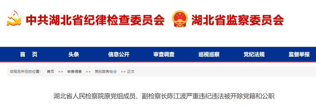 日前,经湖北省委批准,湖北省纪委监委对湖北省人民检察院原党组成员、副检察长陈江波严重违纪违法问题进行了立案审查调查。