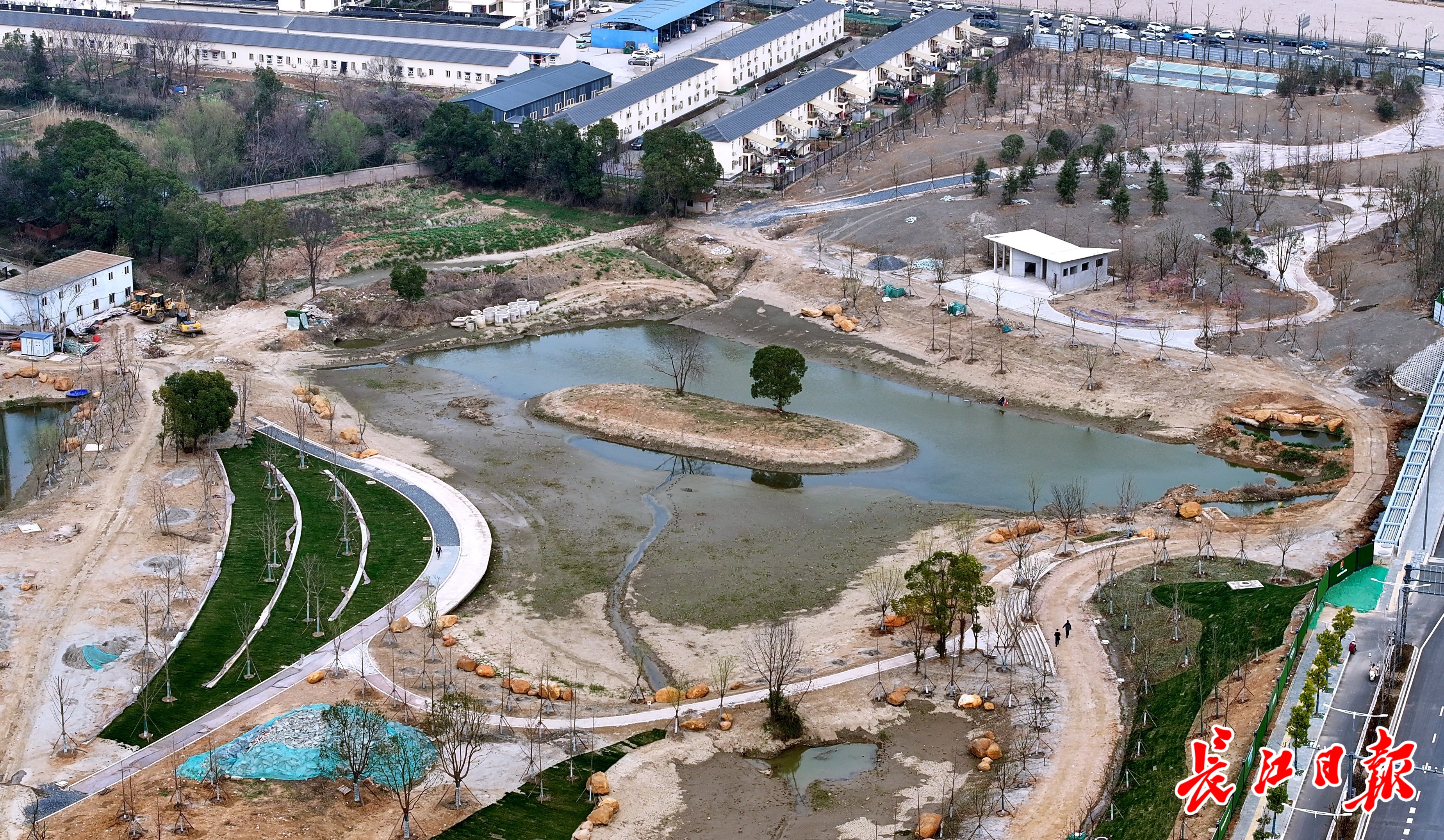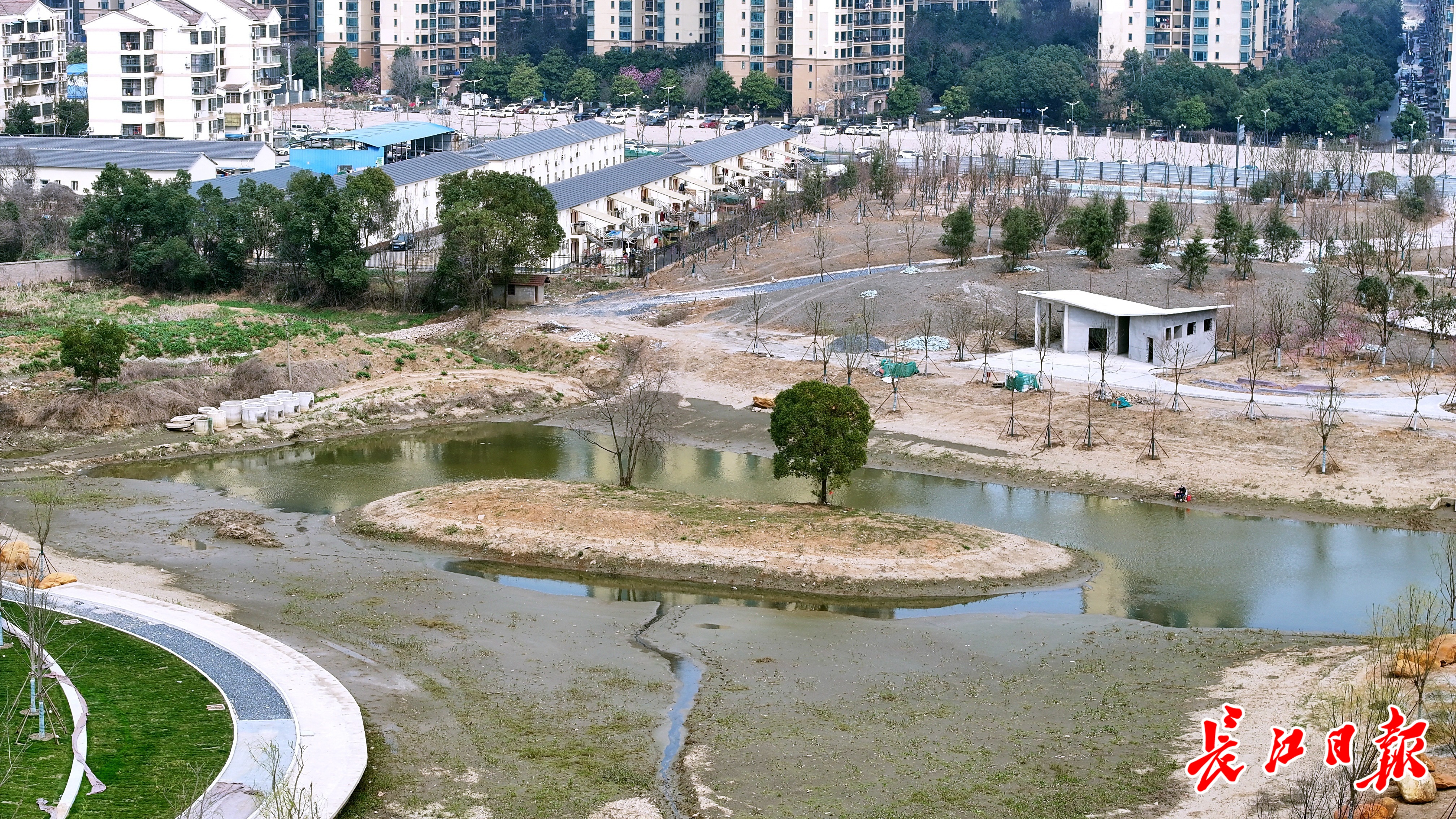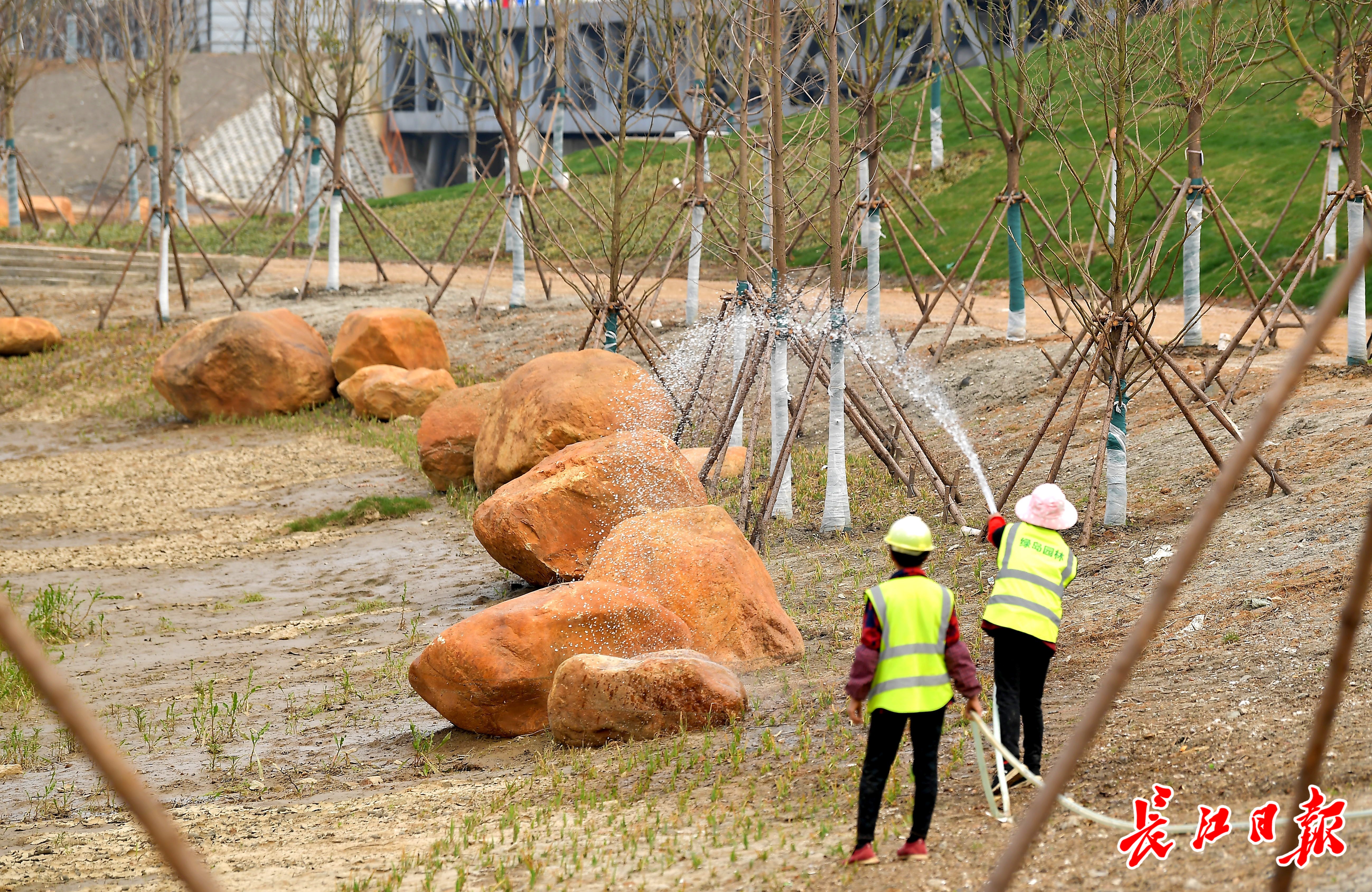 19日,长江日报记者在高罗河廊道二期整治项目现场看到,虽然项目尚未建成,但生态景观雏形已然显现,宽阔的场地被精心设计、划分功能,变成了高低错落、极具层次的生态景观。整治中的高罗河道更宽了,形成两处相互连通的水塘。河道水域中,一处高地被保留,经绿化种植,形成生态岛。休闲步道沿水岸曲折迂回,呈流线型的台阶与青草绿地融为一体。