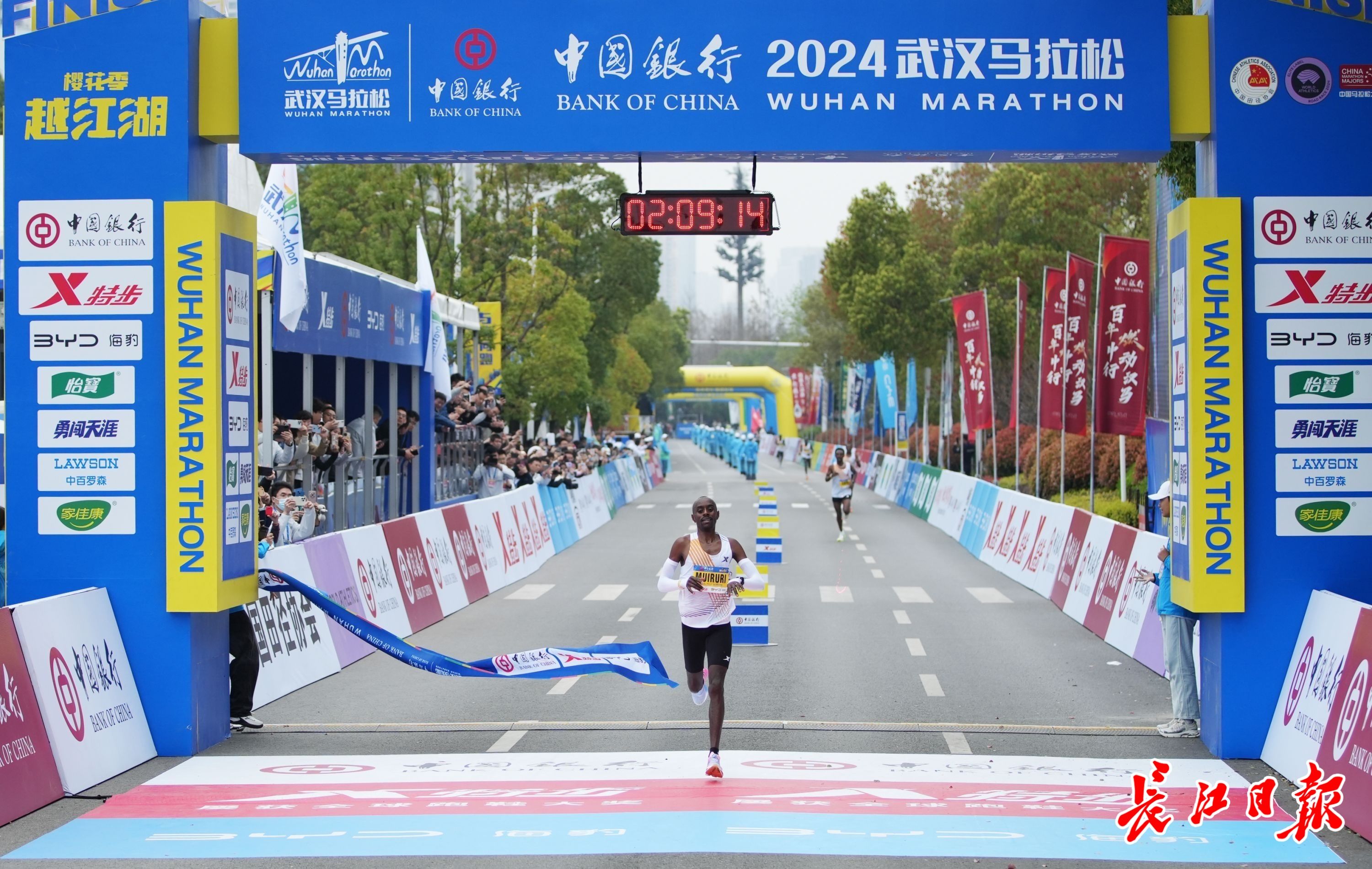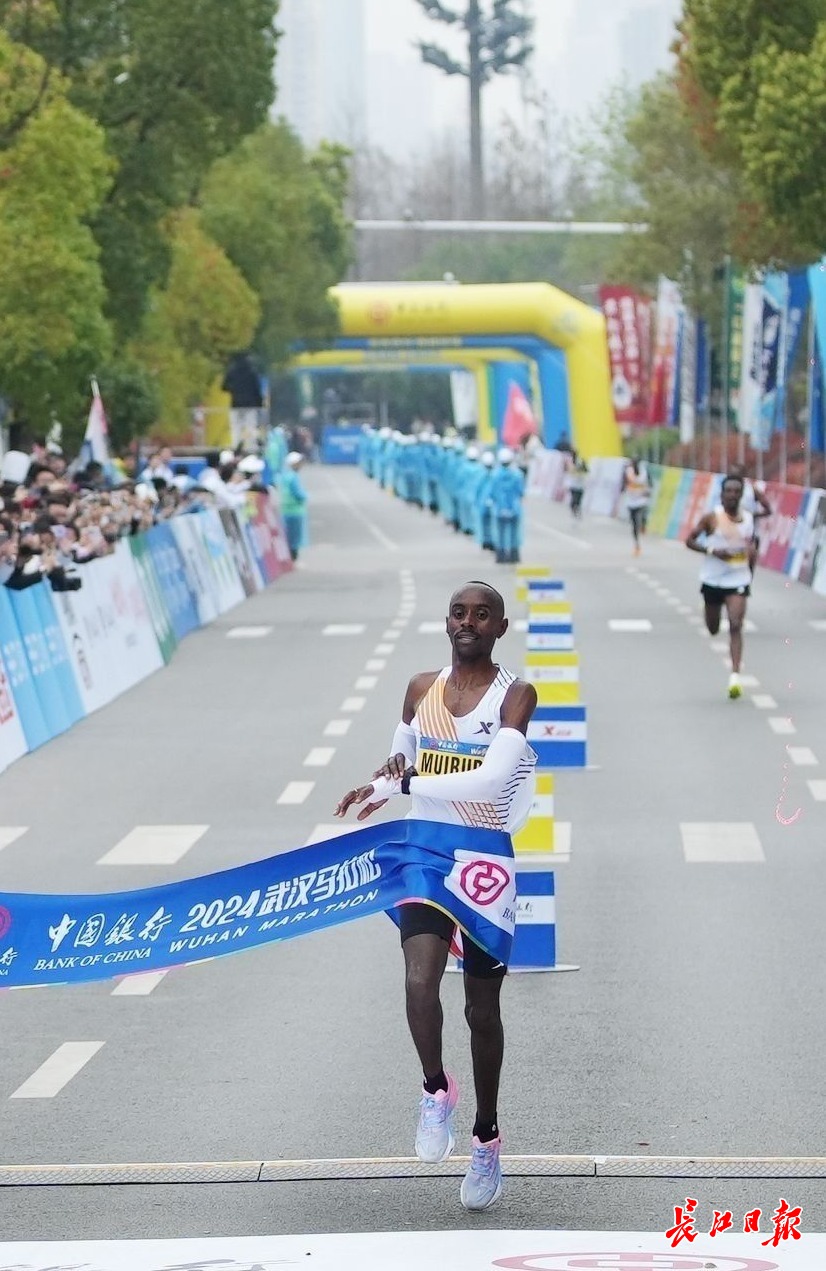 3月24日,2024武汉马拉松男子组全程冠军诞生,男子前三名被非洲籍选手包揽,来自肯尼亚的约翰姆布鲁姆伊鲁利第一个冲过终点,成绩是2小时09分13秒,打破了汉马赛会纪录。