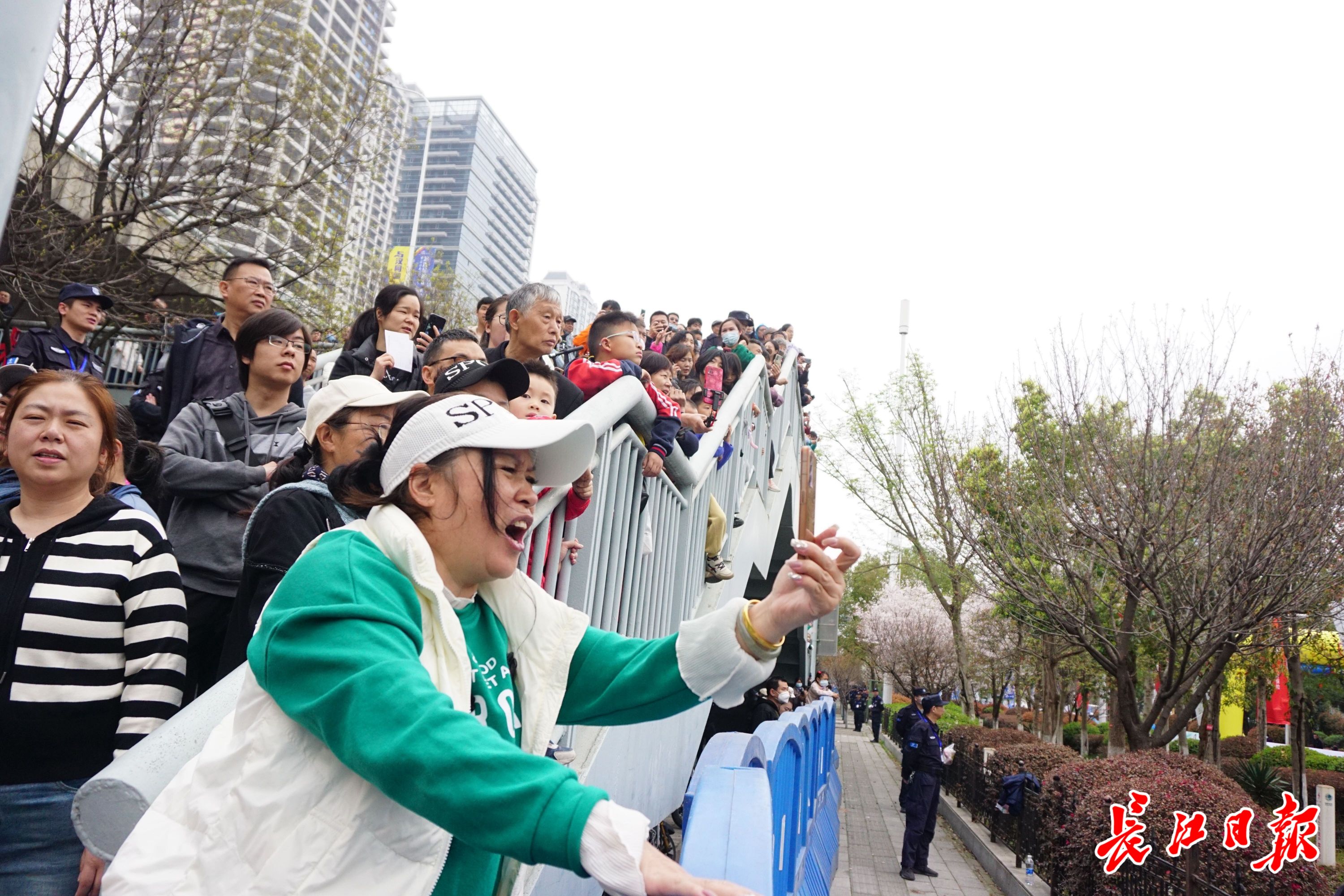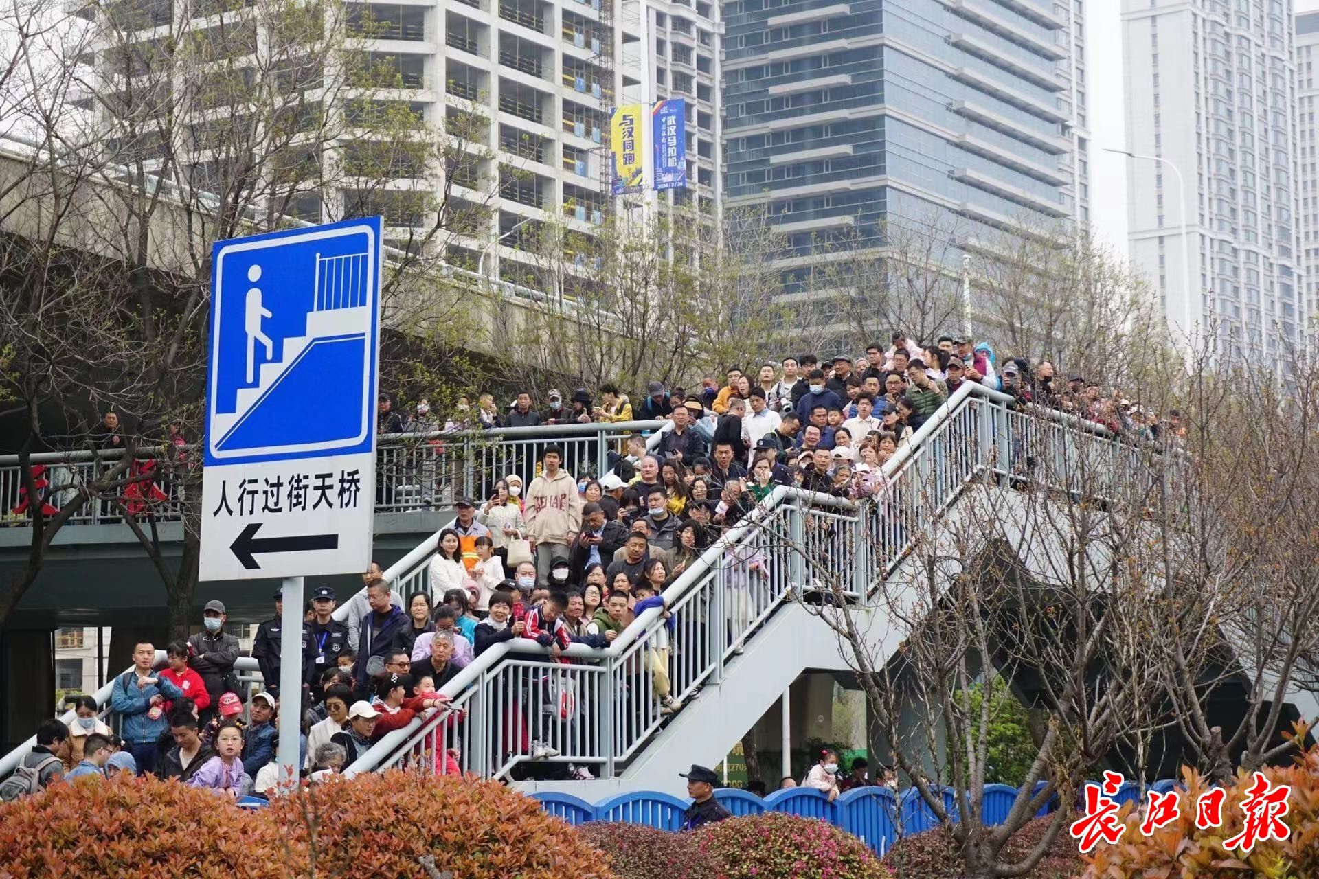 长江日报大武汉客户端3月24日讯(记者秦璟 杨涛)“加油!加油!”3月24日上午10时,随着选手冲线高峰的到来,欢乐大道武汉马拉松终点处天桥上围满市民,欢呼助威声越来越大。赛道上有选手听见助威声,挥手与观众互动。