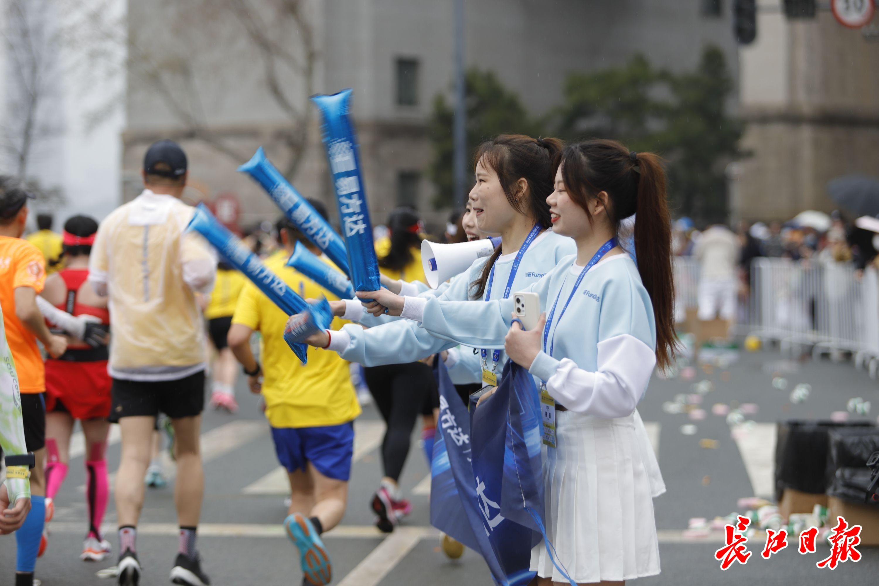 在汉马赛道沿线,路边群众为选手们呐喊加油。记者杨涛 摄