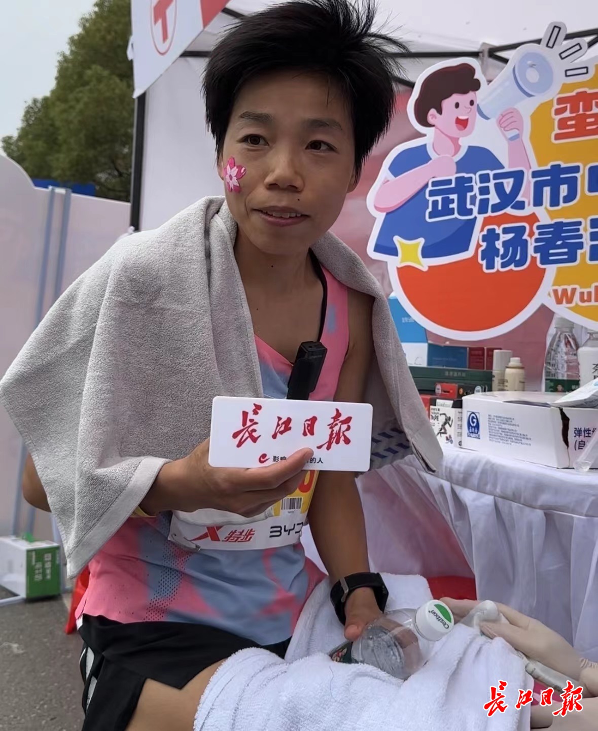她是来自浙江的陈林明,这次比赛用时2小时42分31秒。她不仅对这个成绩很满意,还对武汉的美丽赛道赞叹不已。“跑东湖的时候,景色非常漂亮,粉色的樱花散发着温暖的光芒。我简直沉浸其中,十分享受武汉马拉松!”