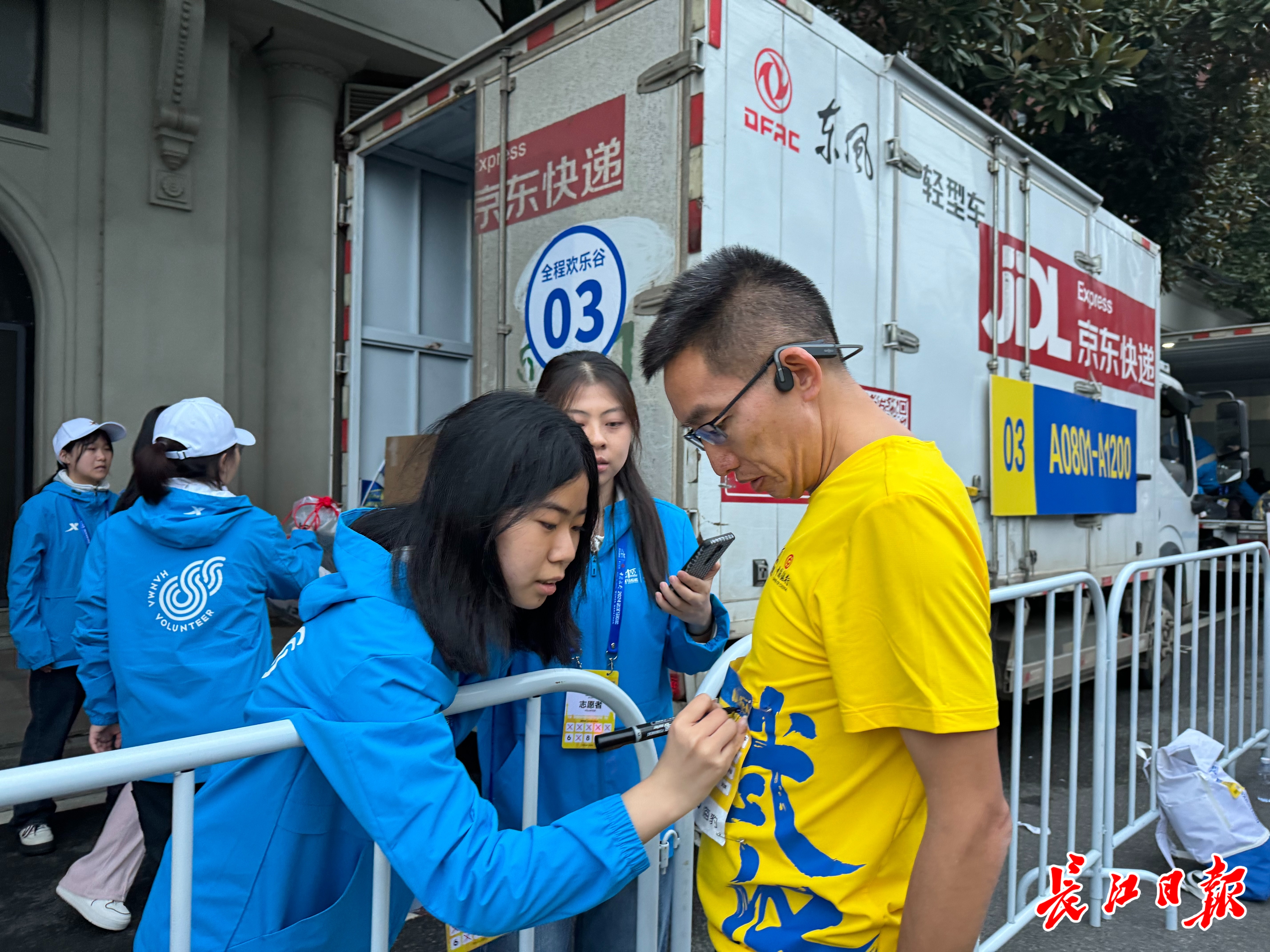 6:30,记者来到存包区,只见这里已经是一片繁忙的景象,而志愿者们也加快了速度,以确保所有选手能在7:15之前顺利完成存包。