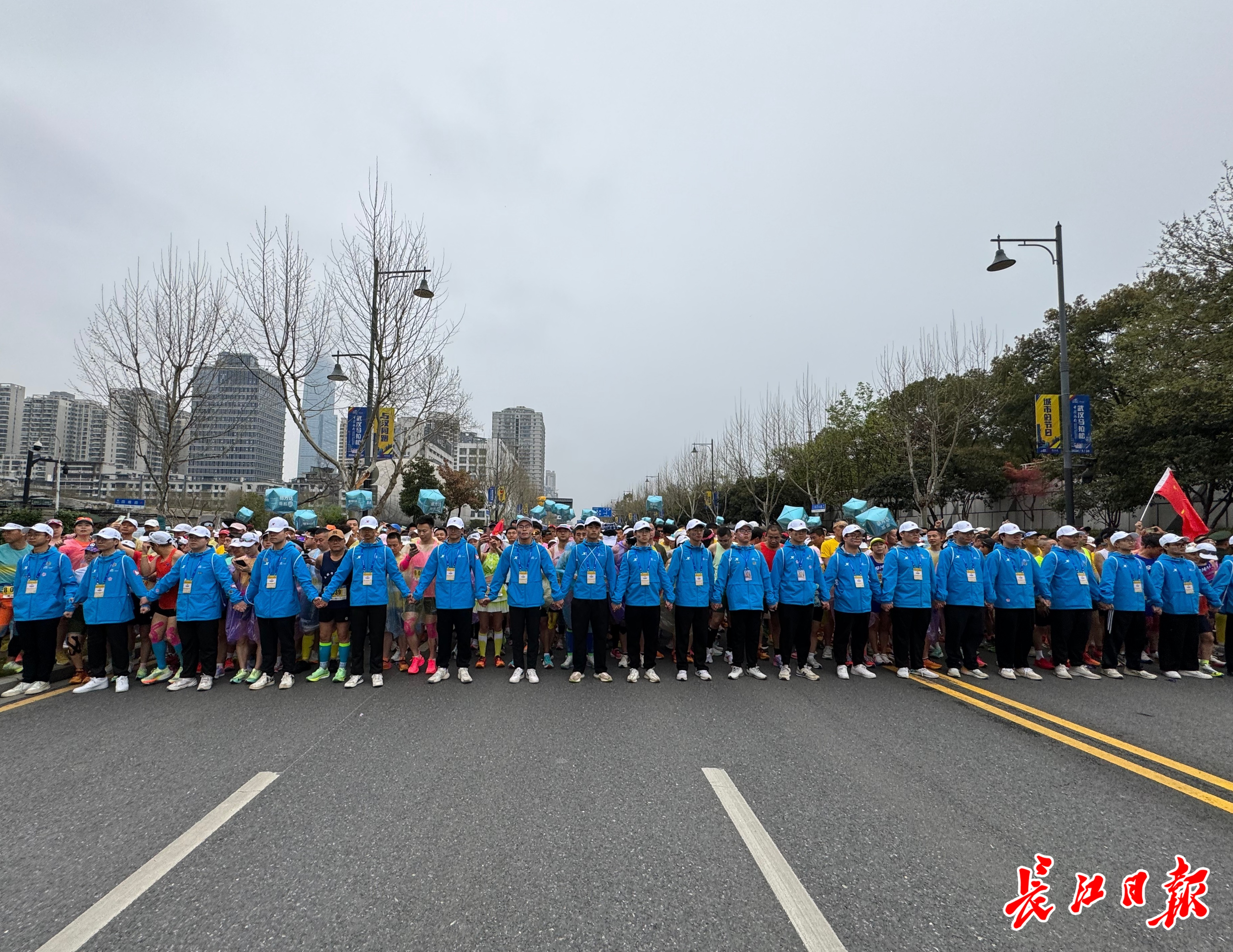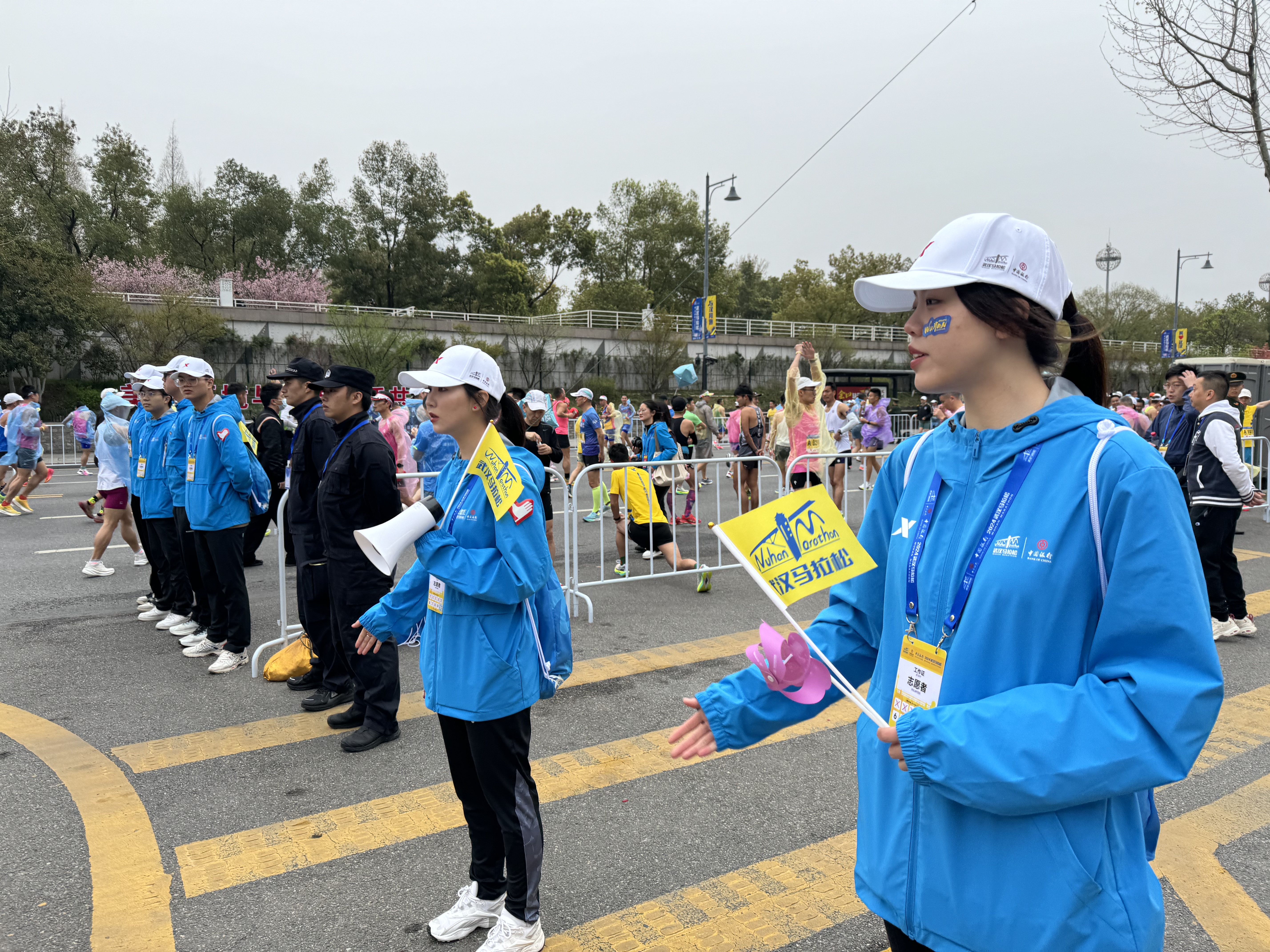 据了解,本届武汉马拉松起点区域由湖北工业大学的666名志愿者提供服务保障,这些志愿者凌晨2点半就在学校集结,4点半抵达永清门,随即按照赛前准备各自抵达服务地点,提供外场引导、集结区分流、远端检录、人墙等志愿服务。