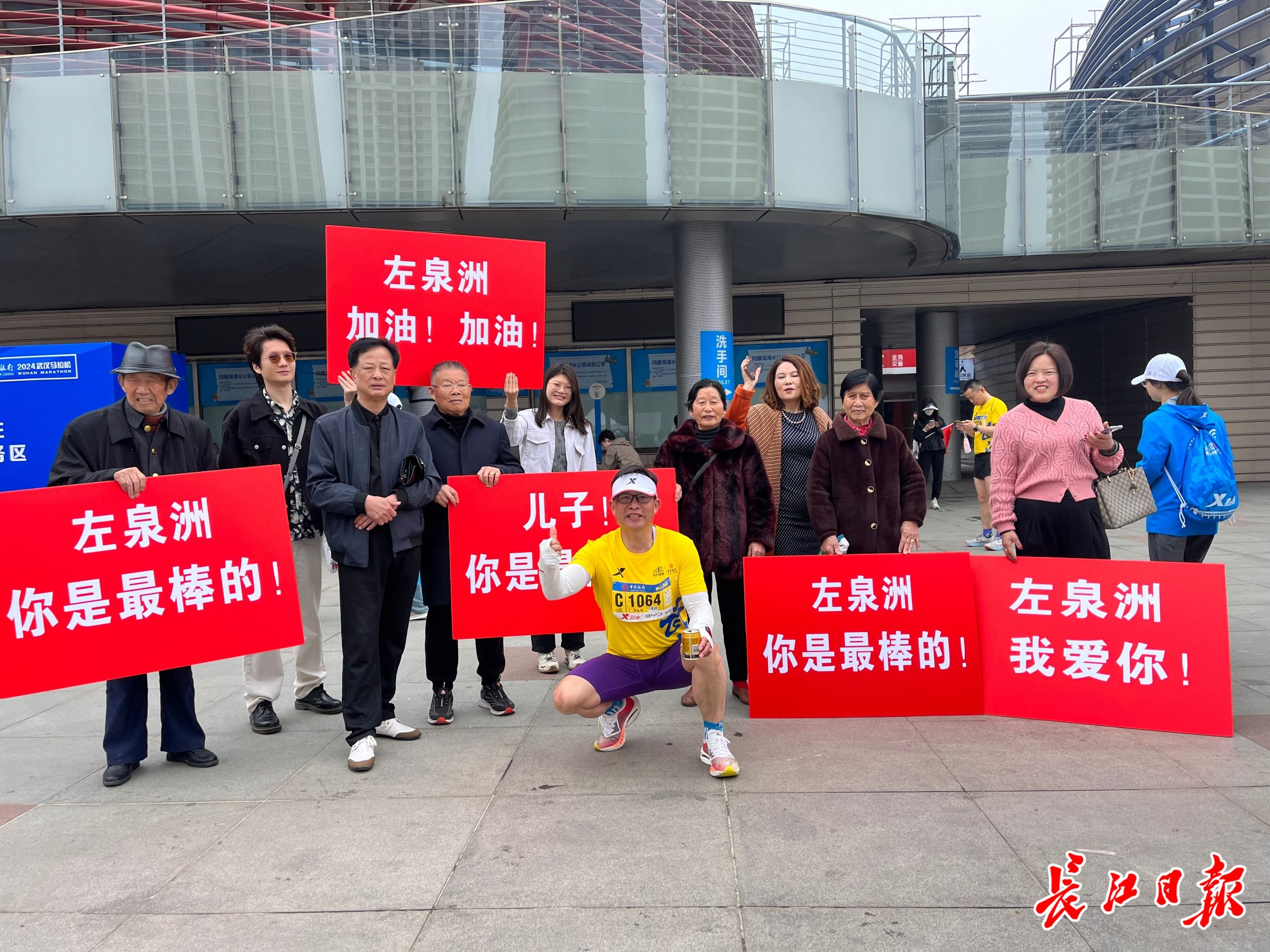 长江日报大武汉客户端3月24日讯(记者秦璟)武汉欢乐谷的汉马终点处,5位观众举着“左泉洲 我们爱你”大红色醒目助威牌,引发网友们关注。24日中午,记者在终点等到了56岁的左泉洲。他和亲人拥抱庆祝。“亲友团”成员给他递上一瓶已经开好盖的饮料,助他快速恢复。