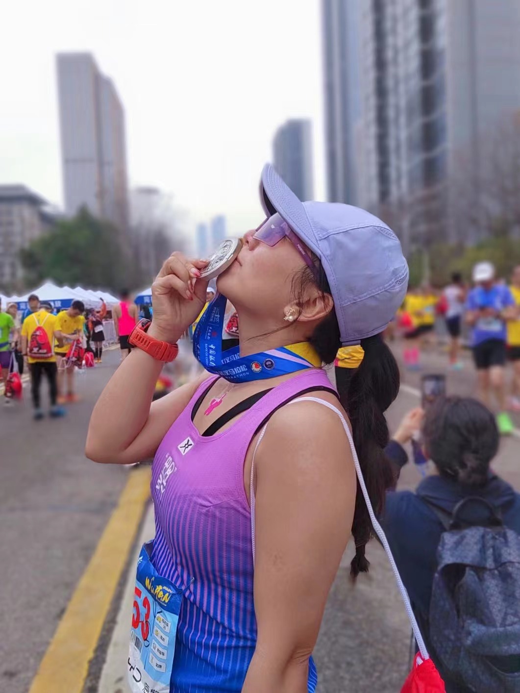 因马拉松认识一座城、恋上一座城。周伟娟赛后亲吻完赛奖牌,“这次半马没跑尽兴,有机会我还要来挑战全马!”