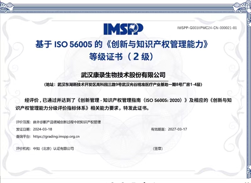 长江日报大武汉客户端3月27日讯(通讯员周麒)近日,武汉康录生物技术股份有限公司传来好消息,该公司已通过创新管理知识产权国际标准(ISO56005)认证,这是生物技术领域全国首家,同时也是湖北省第一家通过该项国际标准认证的企业。