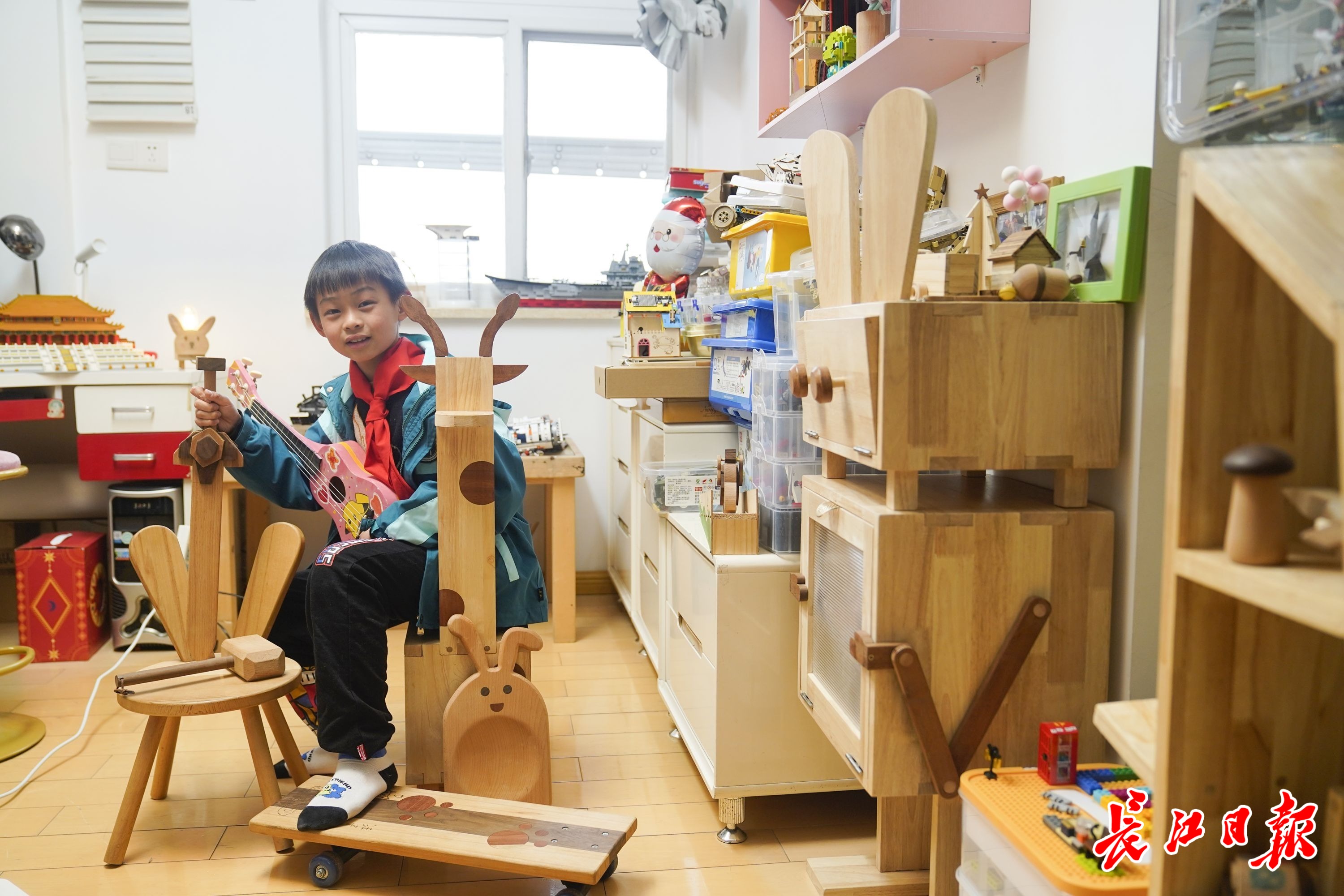 9岁的汪子轩是武汉市江汉区大兴第一实验学校三年级学生,学习木工已经4年多,会做板凳、柜子、书架和各种木头小玩具。用他妈妈的话说,“汪师傅现在打的家具,家里快要放不下了,以后结婚都够用了!”短视频平台上,他做木工的视频冲上了热搜榜,每条视频下面都有网友留言:“能不能上链接?想买!”