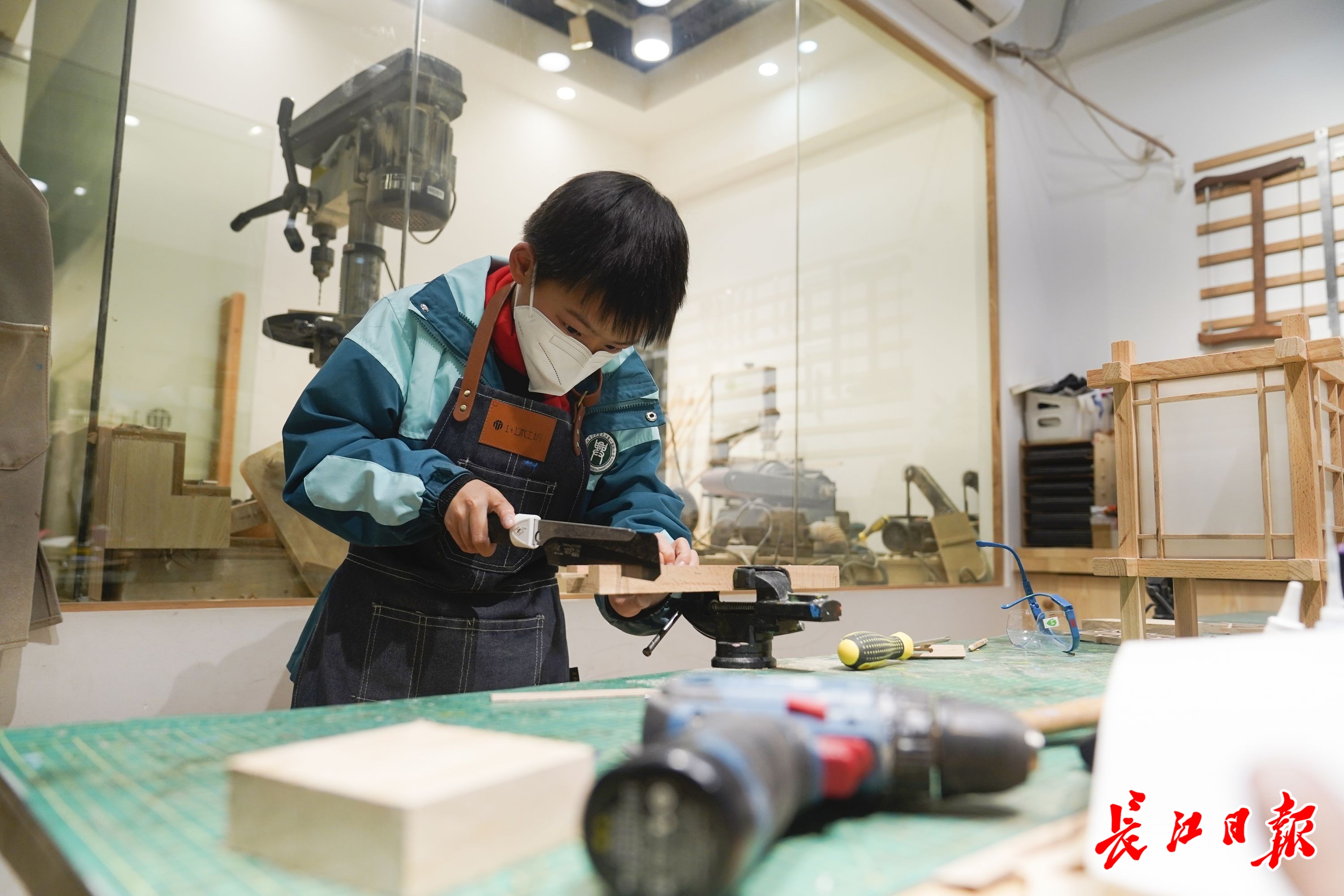 “来体验木工的孩子很多,但像汪子轩这样能坚持下来的屈指可数。他所在高阶班目前只有他一个学生。”工作台边,汪子轩的木工老师感叹。