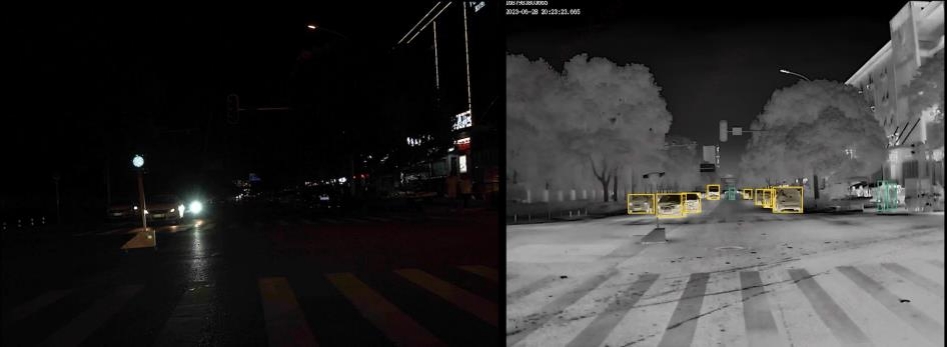 同一场景下可见光影像和红外识别的效果对比。